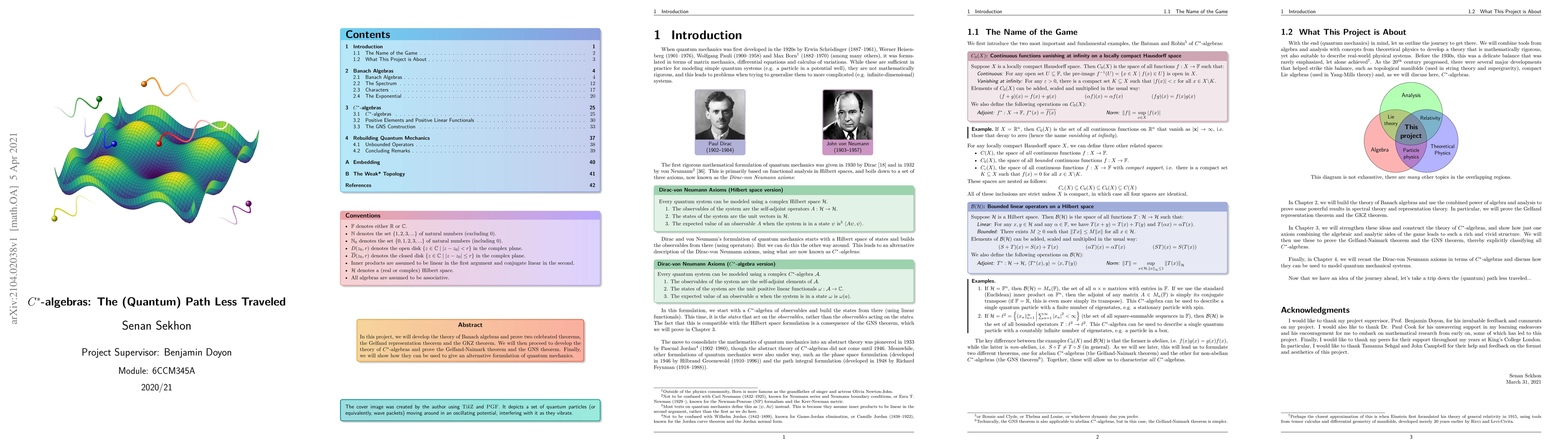In this project, we will develop the theory of Banach algebras and prove two celebrated theorems, the Gelfand representation theorem and the GKZ theorem. We will then proceed to develop the theory of $C^*$-algebras and prove the Gelfand-Naimark theorem and the GNS theorem. Finally, we will show how they can be used to give an alternative formulation of quantum mechanics.