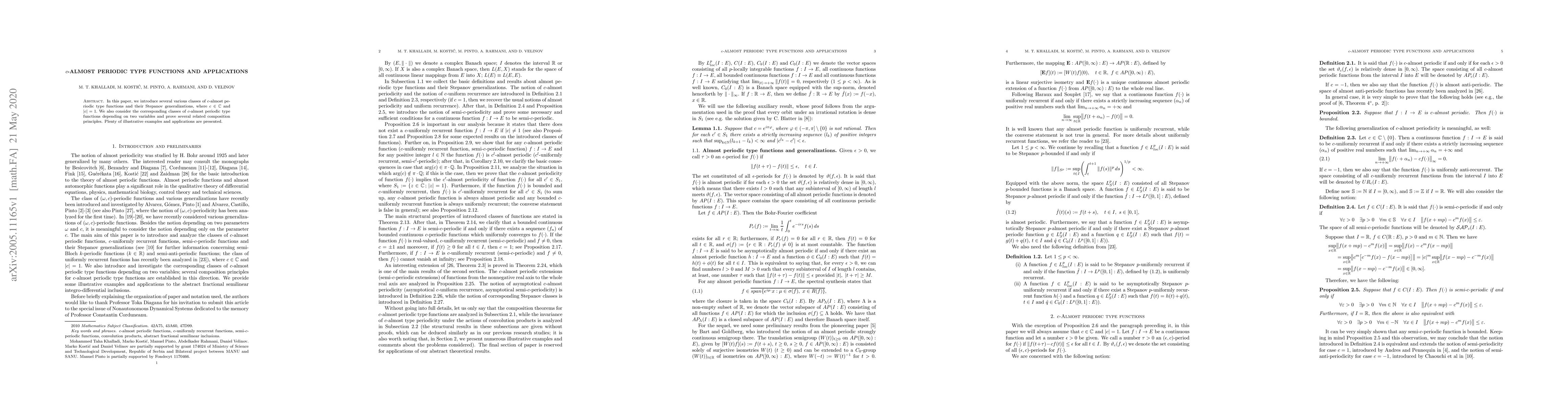 The paper introduces and analyzes various classes of $c$-almost periodic type functions and their Stepanov generalizations, where $c \in \mathbb{C}$ and $|c| = 1$. It also examines the corresponding classes of $c$-almost periodic functions depending on two variables, proving several related composition principles. The analysis includes numerous examples and applications.