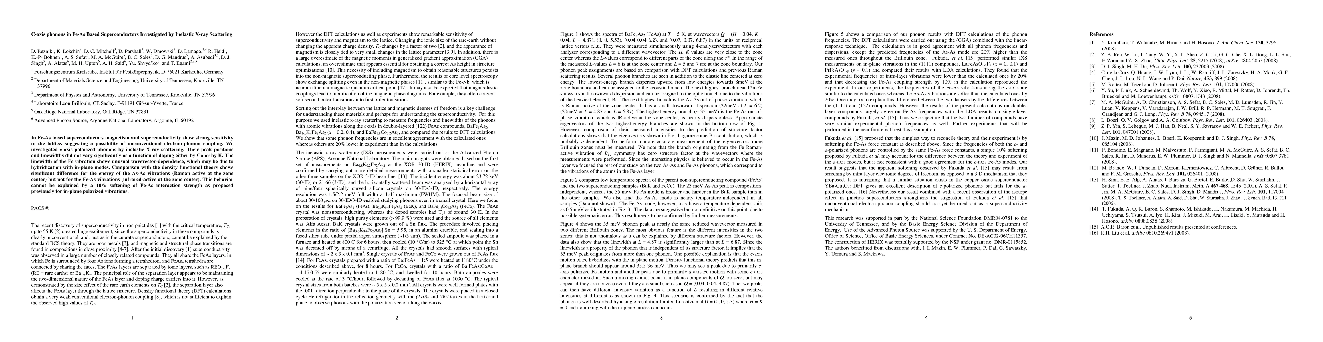 This study investigates c-axis phonons in Fe-As based superconductors using inelastic X-ray scattering, finding no significant variation in phonon peak positions or linewidths with doping. The unusual wavevector-dependence of the Fe vibration linewidth suggests hybridization with in-plane modes, while density functional theory comparisons reveal significant differences in As-As vibrations but not in Fe-As vibrations, challenging previous models of Fe-As interaction softening.