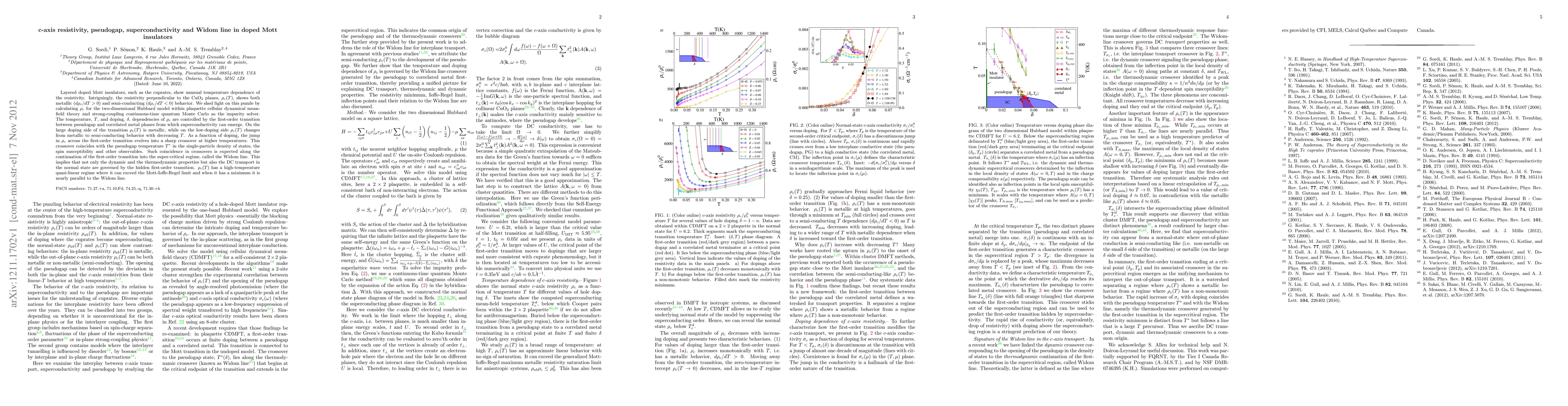 Layered doped Mott insulators, such as the cuprates, show unusual temperature dependence of the resistivity. Intriguingly, the resistivity perpendicular to the CuO$_2$ planes, $\rho_c(T)$, shows both metallic ($d\rho_c/dT > 0$) and semi-conducting ($d\rho_c/dT<0$) behavior. We shed light on this puzzle by calculating $\rho_c$ for the two-dimensional Hubbard model within plaquette cellular dynamical mean-field theory and strong-coupling continuous-time quantum Monte Carlo as the impurity solver. The temperature, $T$, and doping, $\delta$, dependencies of $\rho_c$ are controlled by the first-order transition between pseudogap and correlated metal phases from which superconductivity can emerge. On the large doping side of the transition $\rho_c(T)$ is metallic, while on the low-doping side $\rho_c(T)$ changes from metallic to semi-conducting behavior with decreasing $T$. As a function of doping, the jump in $\rho_c$ across the first-order transition evolves into a sharp crossover at higher temperatures. This crossover coincides with the pseudogap temperature $T^*$ in the single-particle density of states, the spin susceptibility and other observables. Such coincidence in crossovers is expected along the continuation of the first-order transition into the super-critical regime, called the Widom line. This implies that not only the dynamic and the thermodynamic properties but also the DC transport in the normal state are governed by the hidden first-order transition. $\rho_c(T)$ has a high-temperature quasi-linear regime where it can exceed the Mott-Ioffe-Regel limit and when it has a minimum it is nearly parallel to the Widom line.