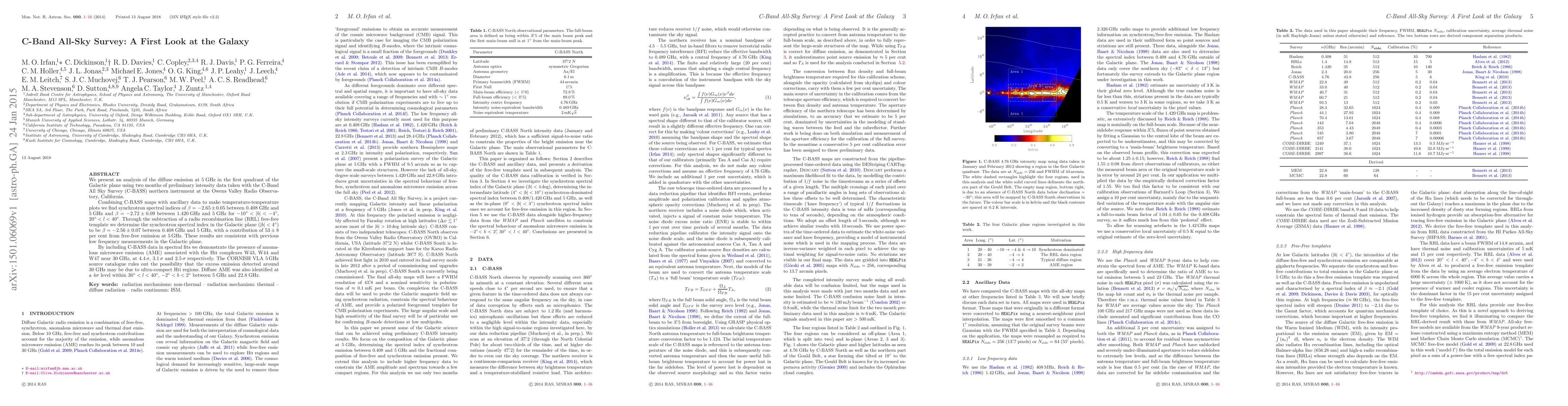 The C-Band All Sky Survey (C-BASS) found synchrotron spectral indices of -2.65 and -2.72 at 5 GHz in the Galactic plane, consistent with previous low-frequency measurements. They also discovered anomalous microwave emission (AME) associated with HII complexes W43, W44, and W47 at 30 GHz, and identified diffuse AME at 4 sigma level between 5 GHz and 22.8 GHz in a specific Galactic region, ruling out ultra-compact HII regions as an alternative source.