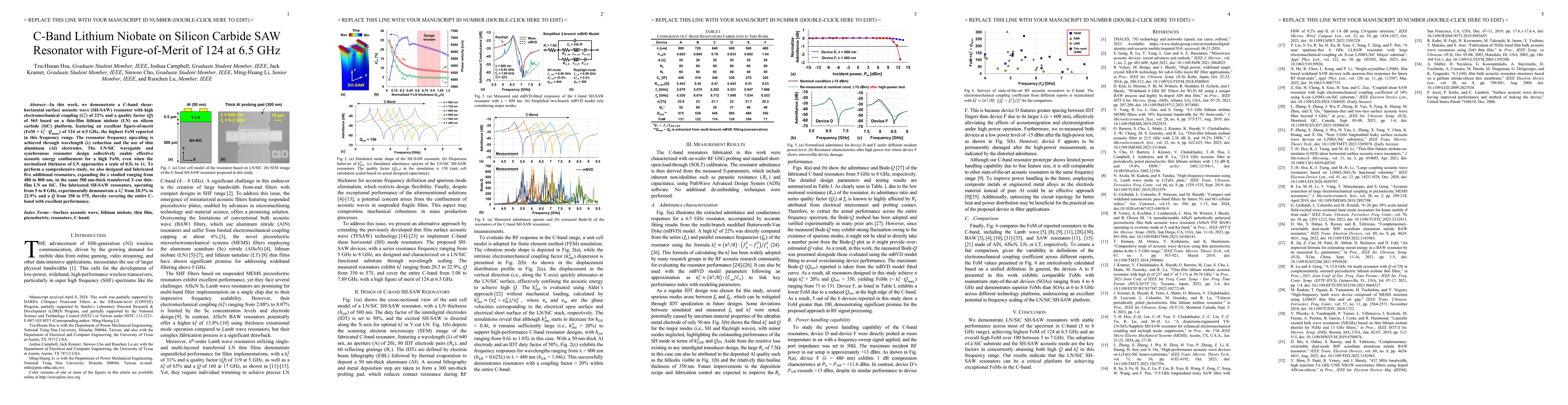 This paper presents a C-band SH-SAW resonator using lithium niobate on silicon carbide, achieving a high figure-of-merit of 124 at 6.5 GHz, the highest reported in this frequency range, with an electromechanical coupling of 22% and a quality factor of 565. The design utilizes thin aluminum electrodes and wavelength reduction for optimal acoustic energy confinement.