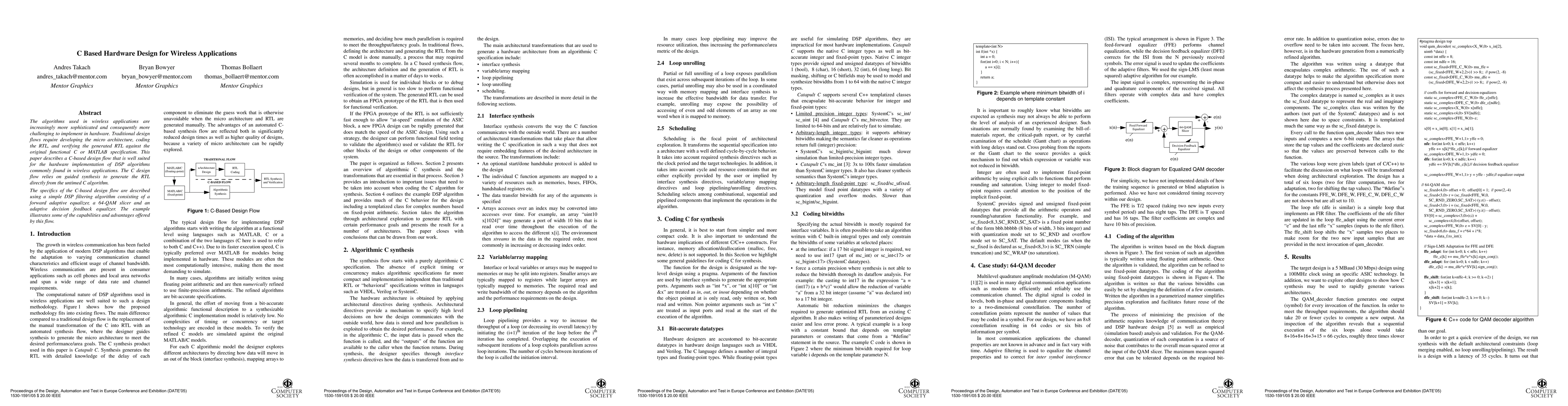 The algorithms used in wireless applications are increasingly more sophisticated and consequently more challenging to implement in hardware. Traditional design flows require developing the micro architecture, coding the RTL, and verifying the generated RTL against the original functional C or MATLAB specification. This paper describes a C-based design flow that is well suited for the hardware implementation of DSP algorithms commonly found in wireless applications. The C design flow relies on guided synthesis to generate the RTL directly from the untimed C algorithm. The specifics of the C-based design flow are described using a simple DSP filtering algorithm consisting of a forward adaptive equalizer, a 64-QAM slicer and an adaptive decision feedback equalizer. The example illustrates some of the capabilities and advantages offered by this flow.