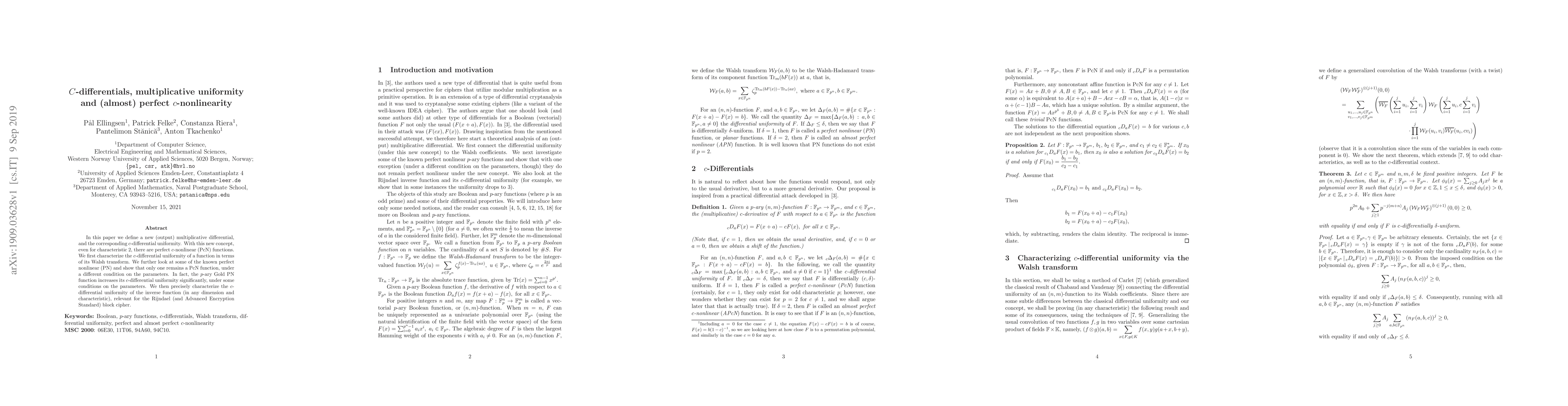 This paper introduces a new multiplicative differential and $c$-differential uniformity, demonstrating perfect $c$-nonlinearity even in characteristic $2$. It characterizes $c$-differential uniformity via the Walsh transform and shows that only one known perfect nonlinear function remains so under altered conditions, while the $p$-ary Gold function enhances its $c$-differential uniformity. The study also precisely characterizes the $c$-differential uniformity of the inverse function, crucial for the Rijndael block cipher.