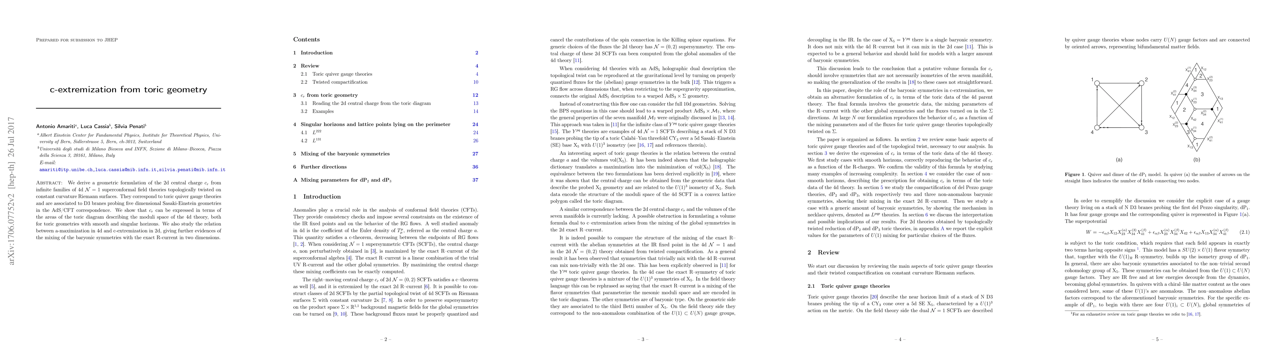 This paper derives a geometric formulation of the 2d central charge $c_r$ from 4d $\mathcal{N}=1$ superconformal field theories, showing its expression in terms of toric diagram areas. It also explores the connection between a-maximization in 4d and c-extremization in 2d, highlighting the interplay between baryonic symmetries and the R-current.