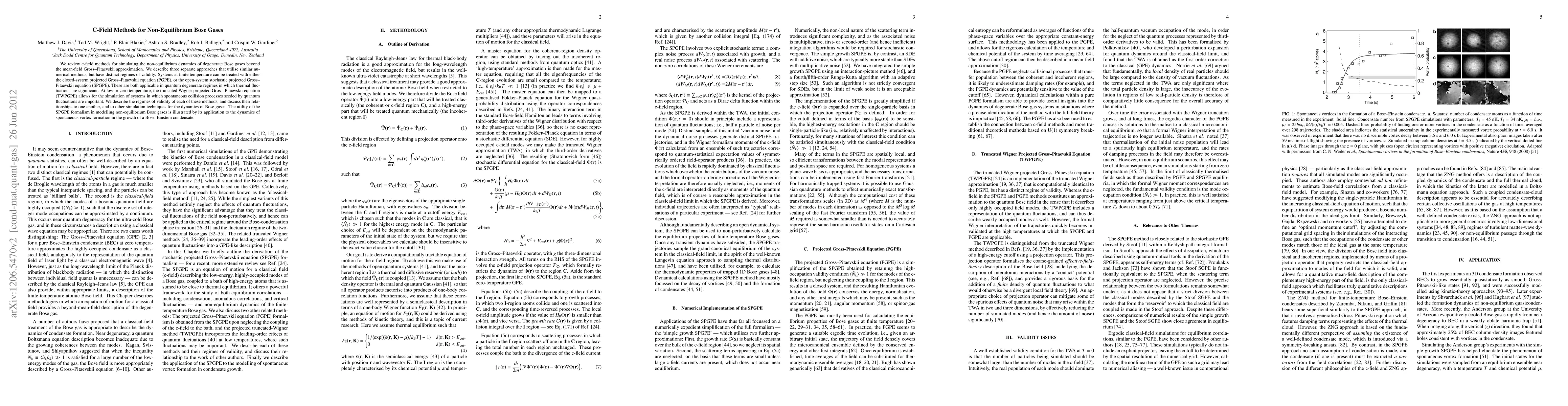 This paper reviews c-field methods for simulating the non-equilibrium dynamics of degenerate Bose gases, detailing three approaches: PGPE, SPGPE, and TWPGPE, each valid in different thermal regimes. The SPGPE is particularly useful for modeling spontaneous vortex formation in Bose-Einstein condensates.