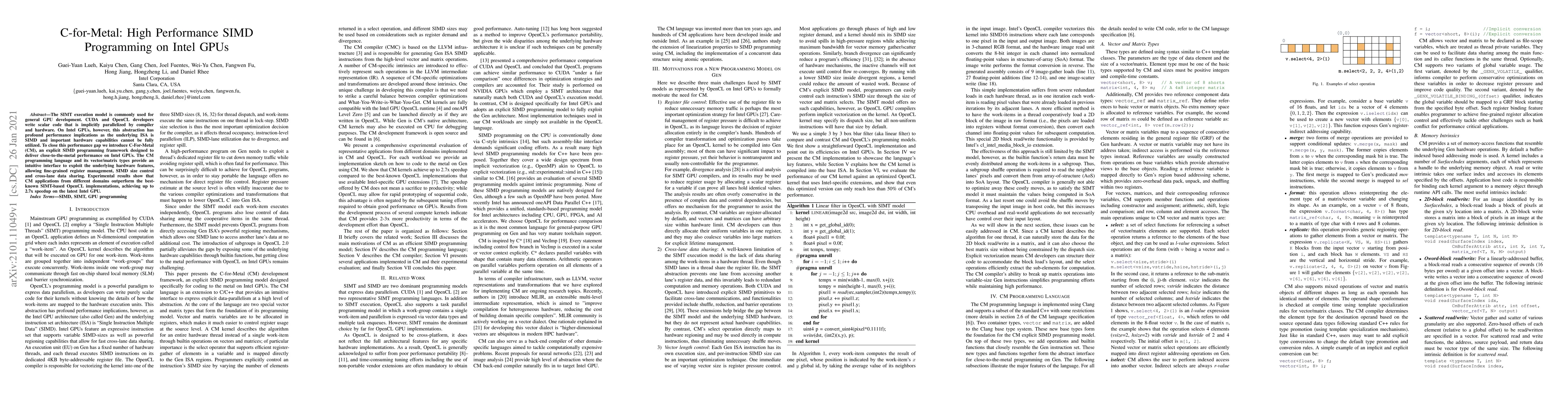 The paper introduces C-For-Metal (CM), an explicit SIMD programming framework for Intel GPUs that leverages the hardware's SIMD capabilities for high performance. CM provides fine-grained control over SIMD operations, resulting in significant speedups, up to 2.7x, compared to existing SIMT-based OpenCL implementations.