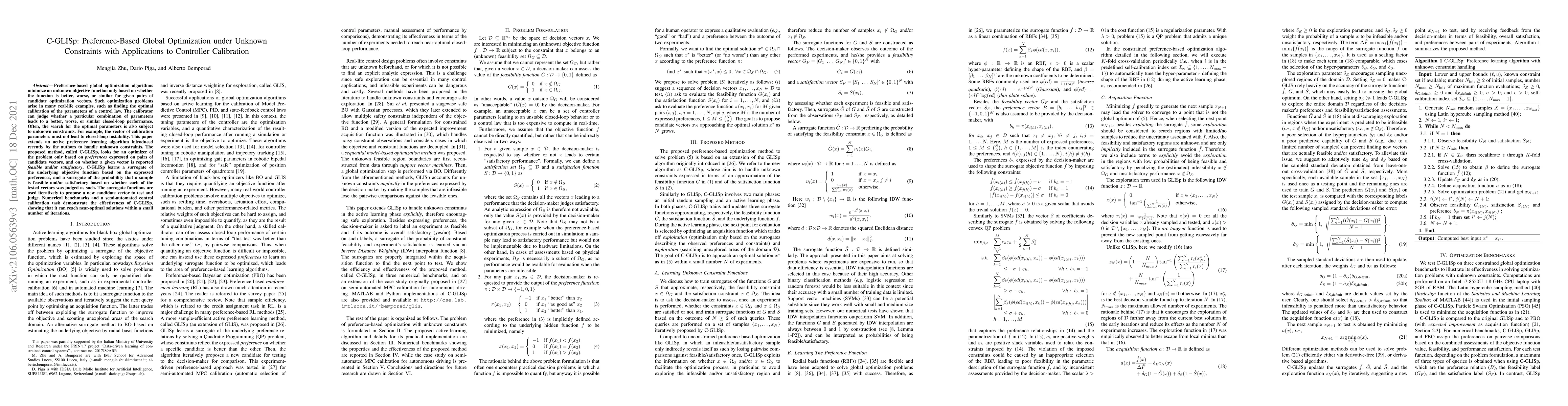 A new optimization algorithm called C-GLISp is proposed to find optimal parameters for control systems under unknown constraints, leveraging preference-based feedback from human judges.
