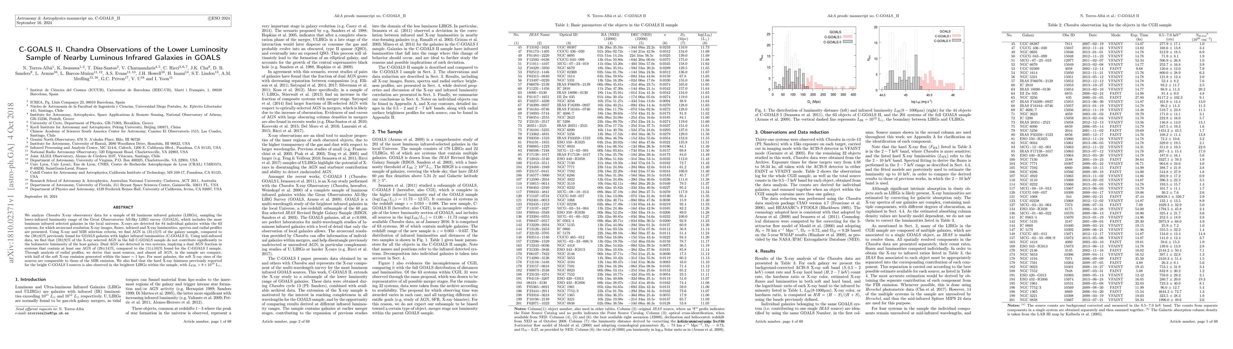 We analyze Chandra X-ray observatory data for a sample of 63 luminous infrared galaxies (LIRGs), sampling the lower-infrared luminosity range of the Great Observatories All-Sky LIRG survey (GOALS), which includes the most luminous infrared selected galaxies in the local universe. X-rays are detected for 84 individual galaxies within the 63 systems, for which arcsecond resolution X-ray images, fluxes, infrared and X-ray luminosities, spectra and radial profiles are presented. Using X-ray and MIR selection criteria, we find AGN in (31$\pm$5)% of the galaxy sample, compared to the (38$\pm$6)% previously found for GOALS galaxies with higher infrared luminosities (C-GOALS I). Using mid-infrared data, we find that (59$\pm$9)% of the X-ray selected AGN in the full C-GOALS sample do not contribute significantly to the bolometric luminosity of the host galaxy. Dual AGN are detected in two systems, implying a dual AGN fraction in systems that contain at least one AGN of (29$\pm$14)%, compared to the (11$\pm$10)% found for the C-GOALS I sample. Through analysis of radial profiles, we derive that most sources, and almost all AGN, in the sample are compact, with half of the soft X-ray emission generated within the inner $\sim 1$ kpc. For most galaxies, the soft X-ray sizes of the sources are comparable to those of the MIR emission. We also find that the hard X-ray faintness previously reported for the bright C-GOALS I sources is also observed in the brightest LIRGs within the sample, with $L_{\rm FIR}>8\times10^{10}$ L$_{\odot}$.