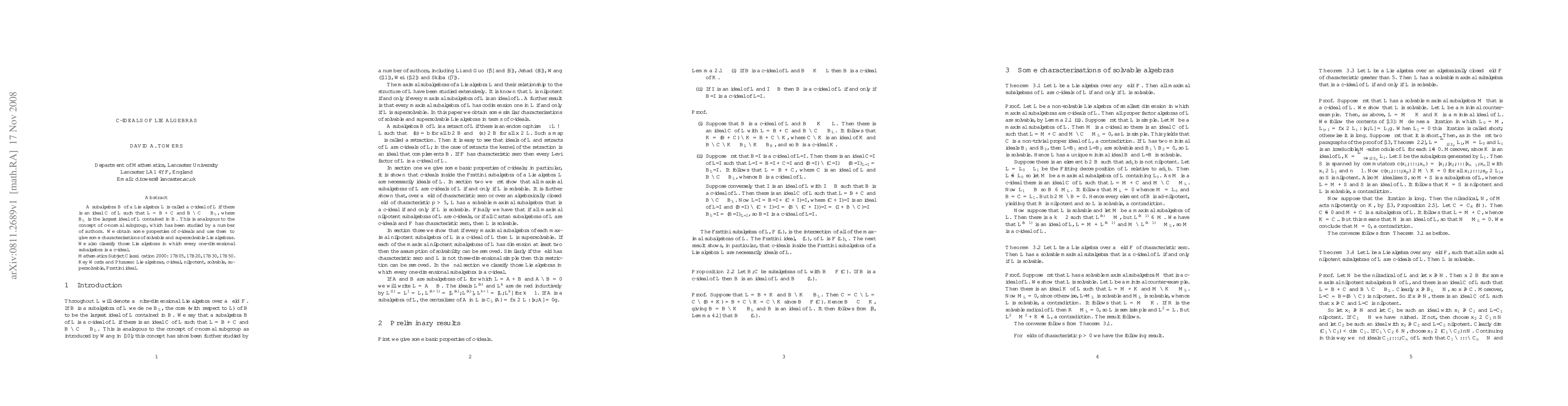 This paper explores the concept of c-ideals in Lie algebras, analogous to c-normal subgroups, and derives properties and characterizations of solvable and supersolvable Lie algebras, as well as classifying Lie algebras where every one-dimensional subalgebra is a c-ideal.