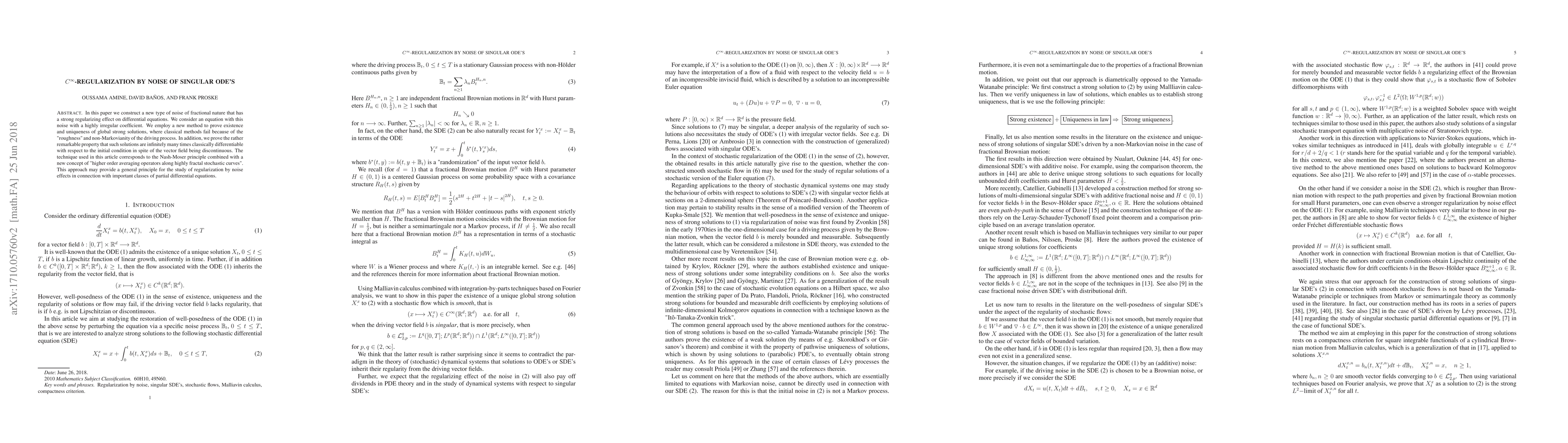 A new type of noise is introduced to have a strong regularizing effect on singular ODEs, proving existence and uniqueness of global solutions with high differentiability properties. This approach may provide a general principle for studying regularization by noise effects in partial differential equations.
