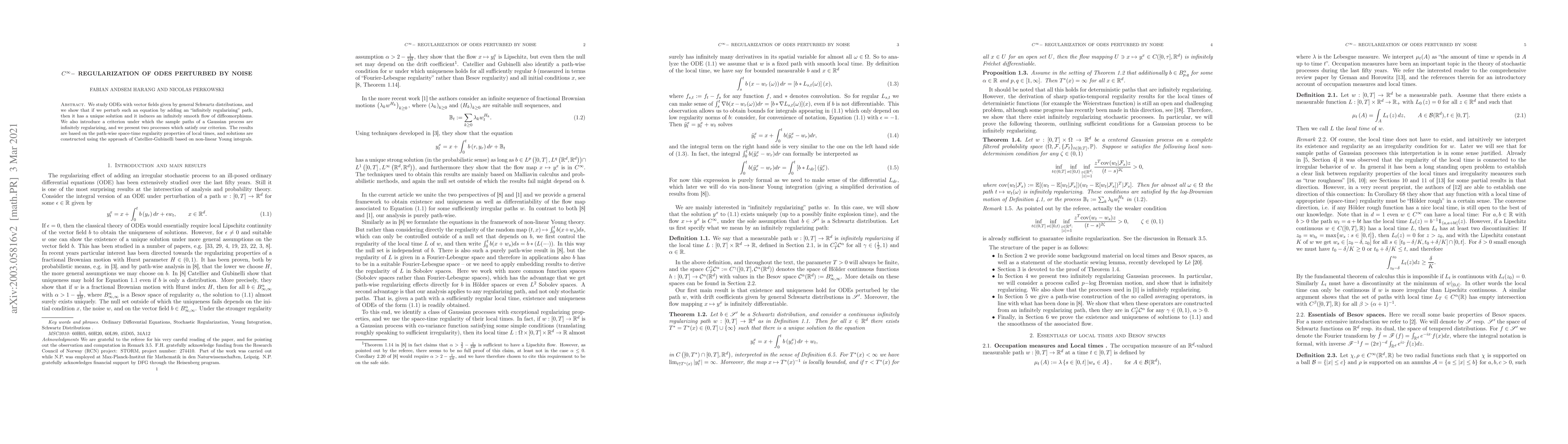 We study ODEs with vector fields given by general Schwartz distributions, and we show that if we perturb such an equation by adding an "infinitely regularizing" path, then it has a unique solution and it induces an infinitely smooth flow of diffeomorphisms. We also introduce a criterion under which the sample paths of a Gaussian process are infinitely regularizing, and we present two processes which satisfy our criterion. The results are based on the path-wise space-time regularity properties of local times, and solutions are constructed using the approach of Catellier-Gubinelli based on non-linear Young integrals.