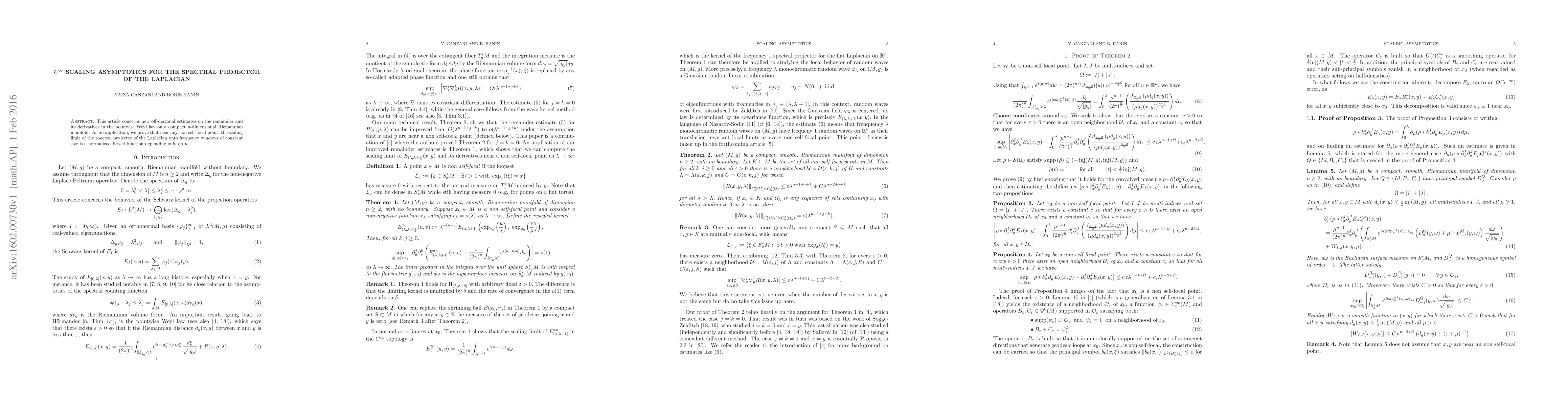 This article concerns new off-diagonal estimates on the remainder and its derivatives in the pointwise Weyl law on a compact n-dimensional Riemannian manifold. As an application, we prove that near any non self-focal point, the scaling limit of the spectral projector of the Laplacian onto frequency windows of constant size is a normalized Bessel function depending only on n.