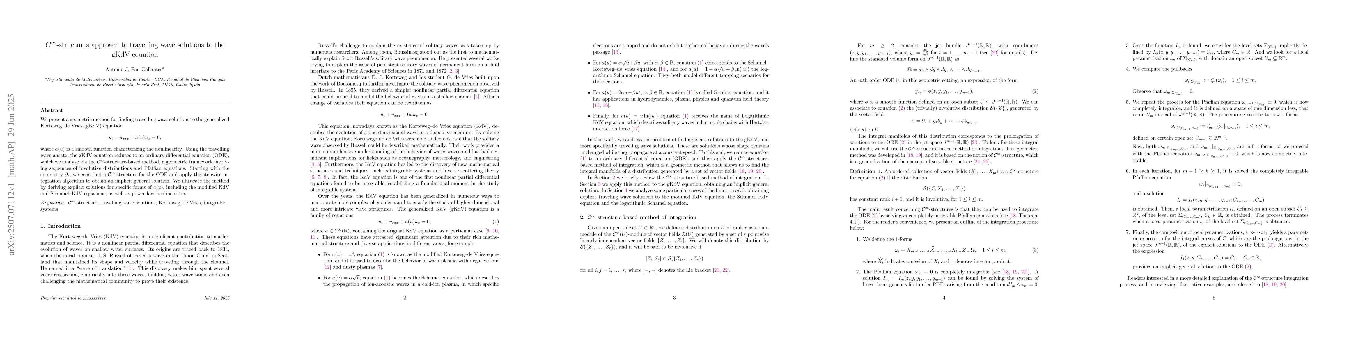 We present a geometric method for finding travelling wave solutions to the generalized Korteweg--de Vries (gKdV) equation $$ u_t + u_{xxx} + a(u)u_x = 0, $$ where $a(u)$ is a smooth function characterizing the nonlinearity. Using the travelling wave ansatz, the gKdV equation reduces to an ordinary differential equation (ODE), which we analyze via the $\mathcal{C}^\infty$-structure-based method, a geometric framework involving sequences of involutive distributions and Pfaffian equations. Starting with the symmetry $\partial_z$, we construct a $\mathcal{C}^\infty$-structure for the ODE and apply the stepwise integration algorithm to obtain an implicit general solution. We illustrate the method by deriving explicit solutions for specific forms of $a(u)$, including the modified KdV and Schamel--KdV equations, as well as power-law nonlinearities.