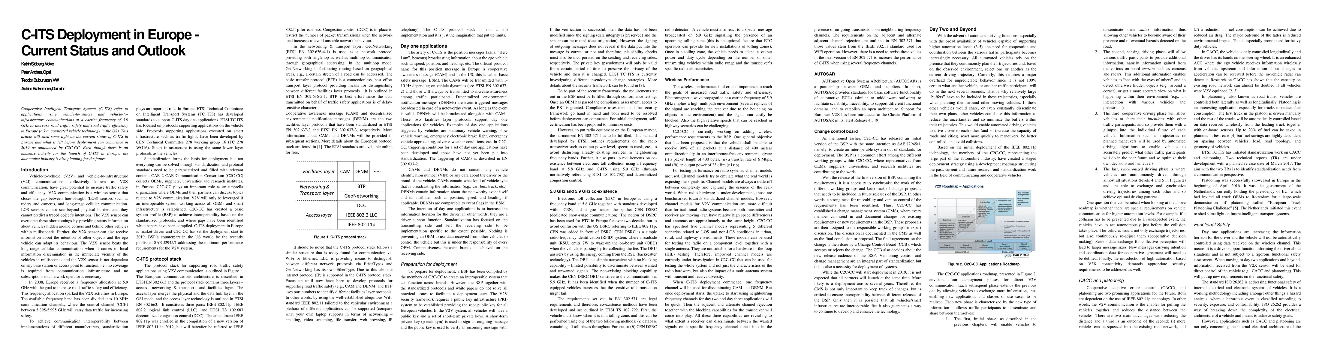 Cooperative Intelligent Transport Systems (C-ITS) refers to applications using vehicle-to-vehicle and vehicle-to-infrastructure communications at a carrier frequency of 5.9 GHz to increase road traffic safety and road traffic efficiency in Europe (a.k.a. connected vehicle technology in the US). This article will shed some light on the current status of C-ITS in Europe and what is left before deployment can commence in 2019 as announced by C2C-CC. Even though there is an immense activity for the launch of C-ITS in Europe, the automotive industry is also planning for the future.