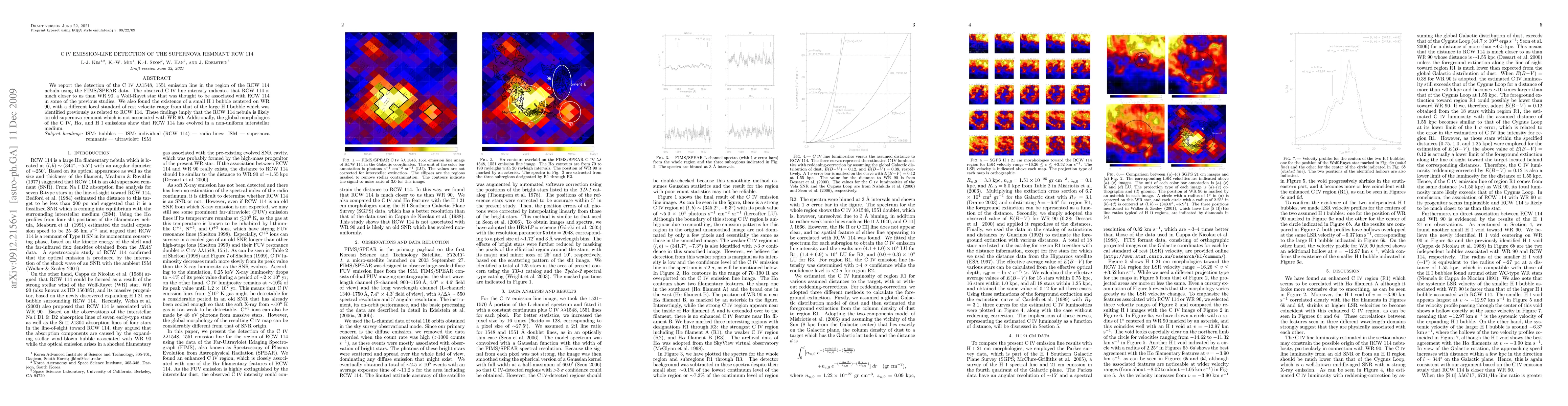 We report the detection of the C IV 1548, 1551 emission line in the region of the RCW 114 nebula using the FIMS/SPEAR data. The observed C IV line intensity indicates that RCW 114 is much closer to us than WR 90, a Wolf-Rayet star that was thought to be associated with RCW 114 in some of the previous studies. We also found the existence of a small H I bubble centered on WR 90, with a different local standard of rest velocity range from that of the large H I bubble which was identified previously as related to RCW 114. These findings imply that the RCW 114 nebula is an old supernova remnant which is not associated with WR 90. Additionally, the global morphologies of the C IV, H-alpha, and H I emissions show that RCW 114 has evolved in a non-uniform interstellar medium.