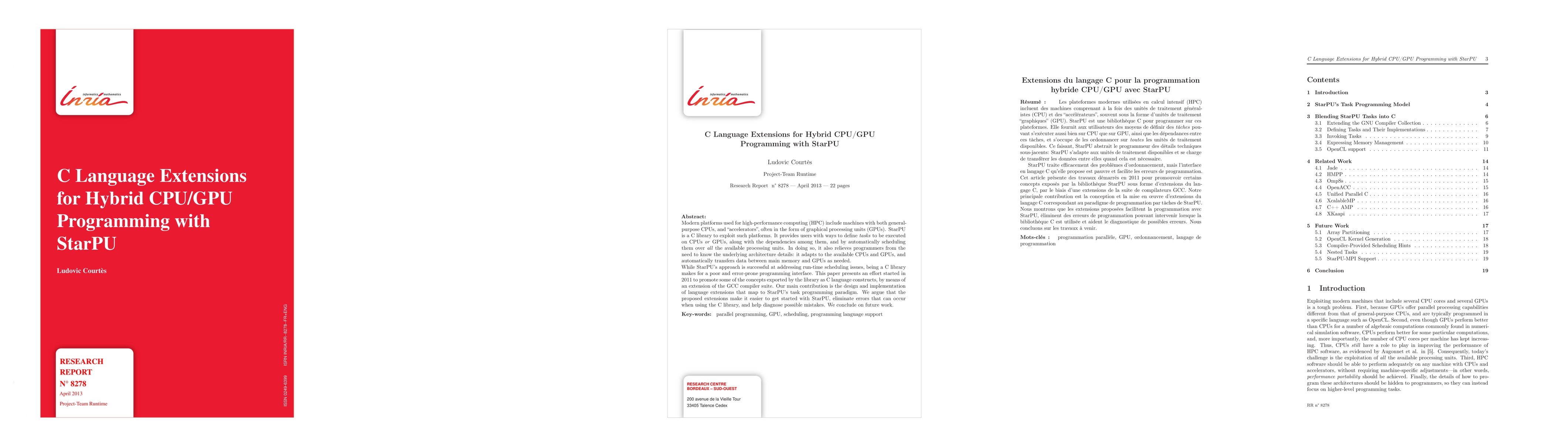 This paper introduces C language extensions for the StarPU library, aimed at simplifying hybrid CPU/GPU programming by mapping StarPU's task paradigm directly into the C language. These extensions, implemented via the GCC compiler, aim to reduce errors and improve the usability of the library.