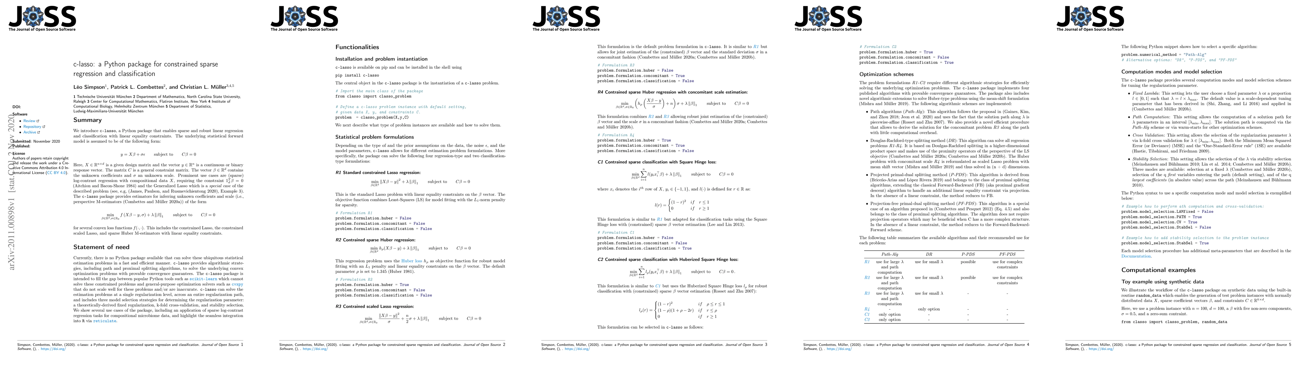c-lasso is a Python package for performing sparse and robust linear regression and classification with linear equality constraints. It provides estimators for inferring unknown coefficients and scale under various convex loss functions, including the constrained Lasso and sparse Huber M-estimators.