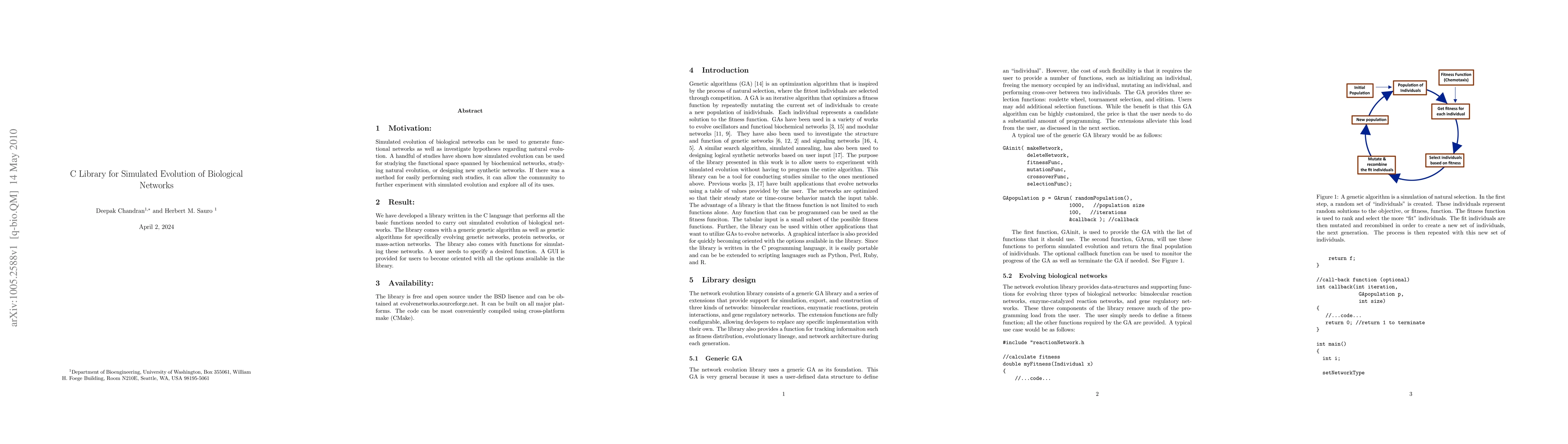 Researchers developed a free, open-source C library for simulated evolution of biological networks, enabling users to explore network functions and natural evolution, with GUI support and multi-platform compatibility.