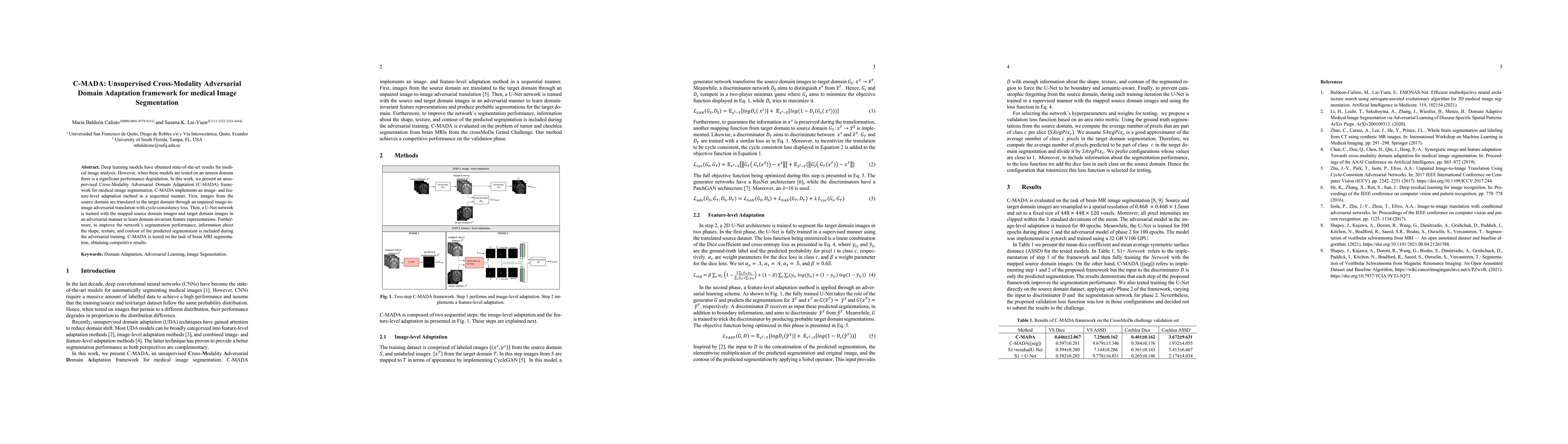This paper introduces an unsupervised Cross-Modality Adversarial Domain Adaptation (C-MADA) framework for medical image segmentation, which translates source domain images to the target domain via adversarial translation and trains a U-Net network to learn domain-invariant features, achieving competitive results in brain MRI segmentation.