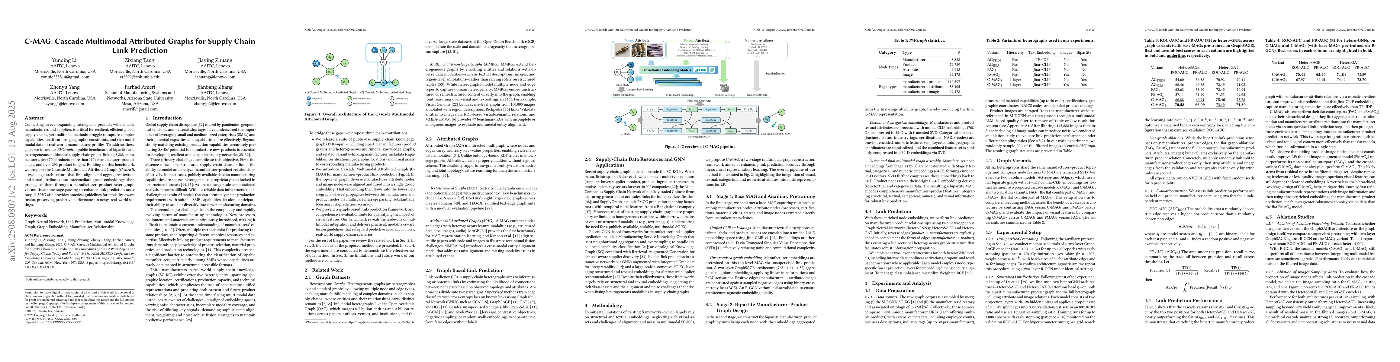 C-MAG distinguishes itself by focusing on multimodal attributed graphs for supply chain link prediction, employing a cascade architecture that first aggregates textual and visual attributes into intermediate embeddings, then propagates them through a manufacturer-product hetero-graph for enhanced link prediction.