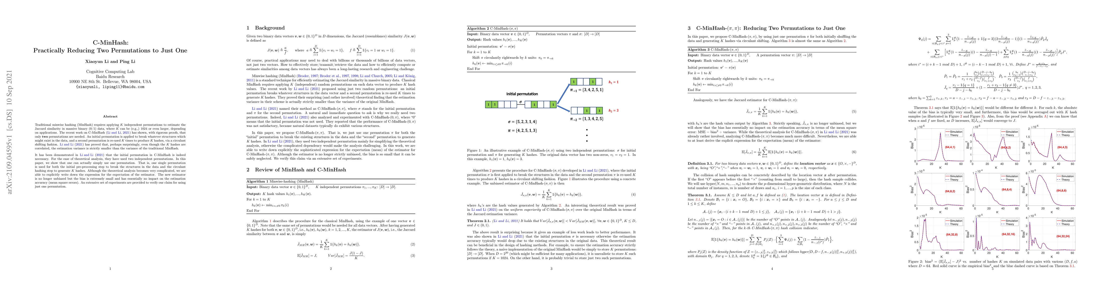 This paper proposes a simplified version of C-MinHash that uses a single permutation instead of two, reducing computational overhead. While the theoretical analysis is complex, experiments show minimal bias and high estimation accuracy, validating the practical benefits of this approach.