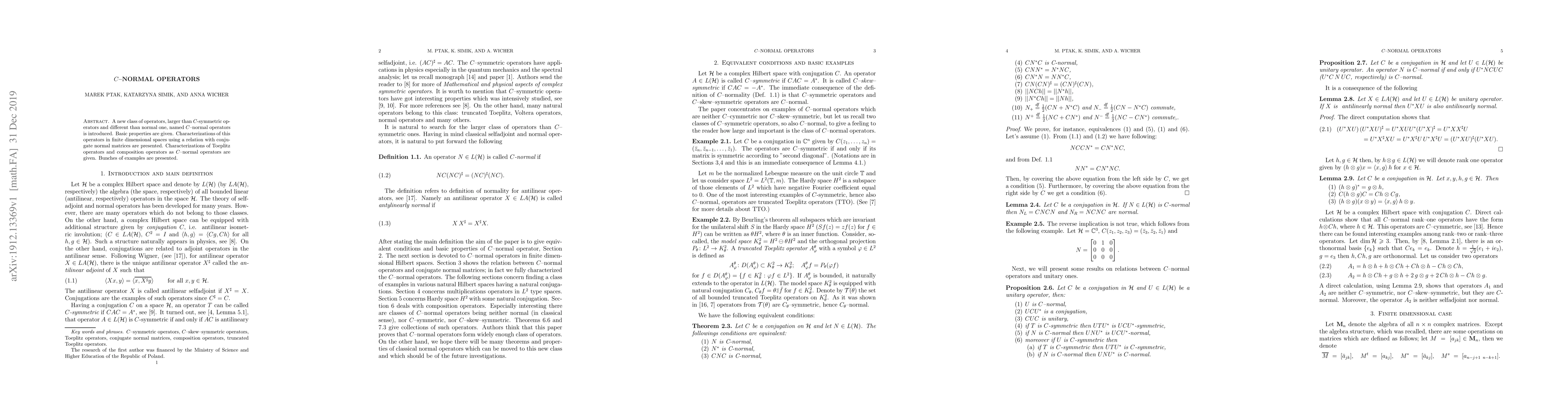 A new class of operators, larger than $C$-symmetric operators and different than normal one, named $C$--normal operators is introduced. Basic properties are given. Characterizations of this operators in finite dimensional spaces using a relation with conjugate normal matrices are presented.