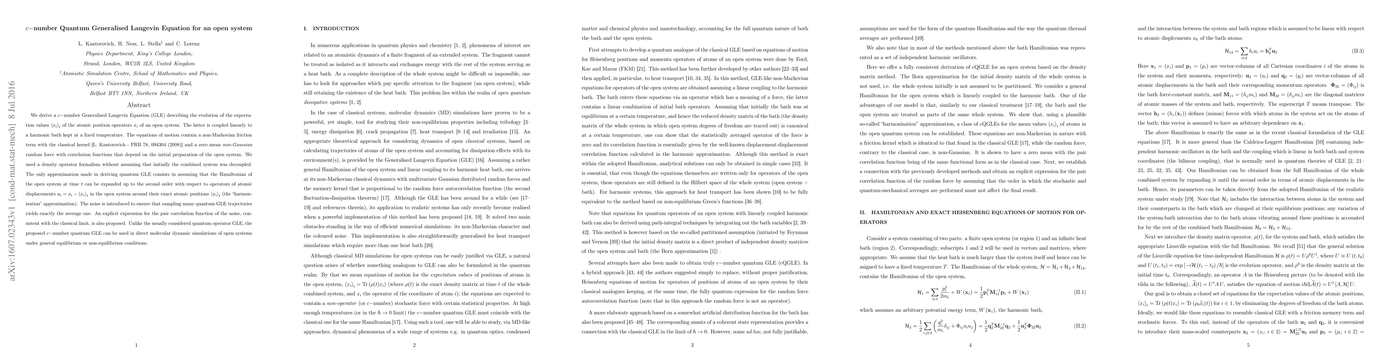 This paper derives a $c-$number Generalised Langevin Equation (GLE) to describe the evolution of atomic position expectation values in an open system coupled to a harmonic bath. The GLE includes a non-Markovian friction term and a non-Gaussian random force, allowing for direct molecular dynamic simulations under various equilibrium conditions.