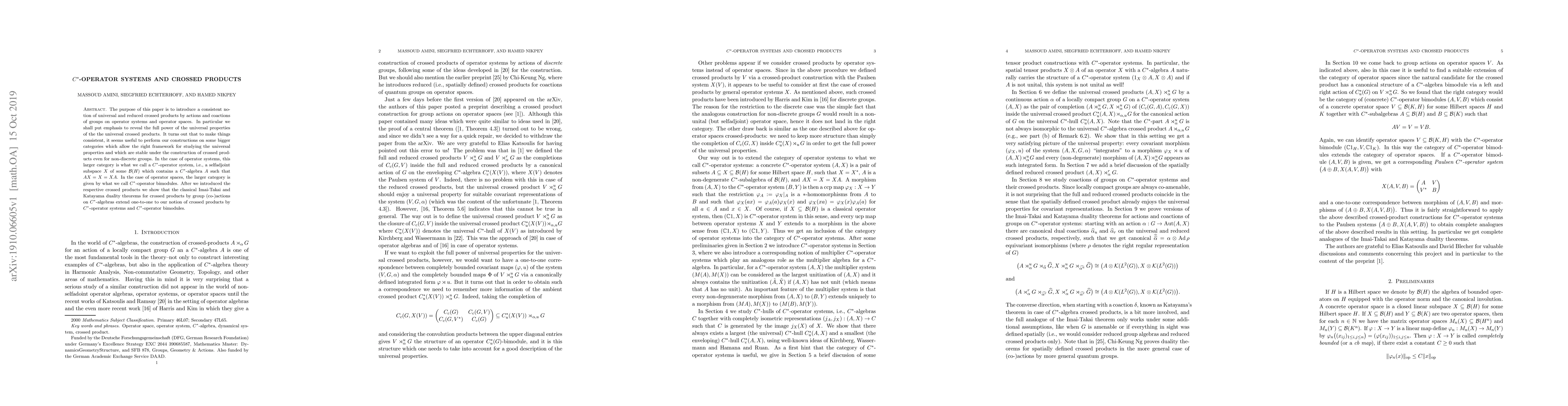 This paper introduces universal and reduced crossed products for actions and coactions of groups on $C^*$-operator systems and bimodules, highlighting their universal properties. It extends classical duality theorems for crossed products of $C^*$-algebras to these broader categories.