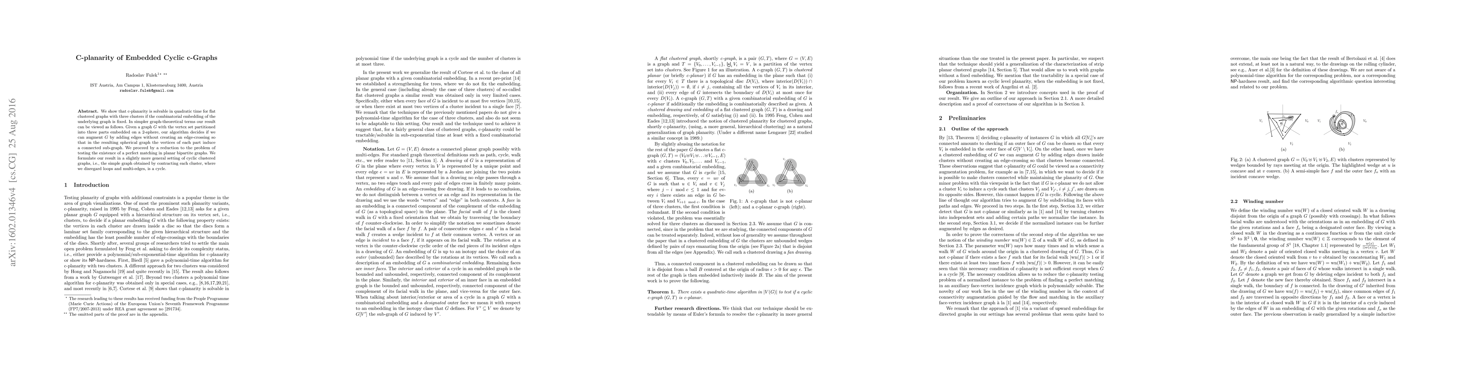 We show that c-planarity is solvable in quadratic time for flat clustered graphs with three clusters if the combinatorial embedding of the underlying graph is fixed. In simpler graph-theoretical terms our result can be viewed as follows. Given a graph $G$ with the vertex set partitioned into three parts embedded on a 2-sphere, our algorithm decides if we can augment $G$ by adding edges without creating an edge-crossing so that in the resulting spherical graph the vertices of each part induce a connected sub-graph. We proceed by a reduction to the problem of testing the existence of a perfect matching in planar bipartite graphs. We formulate our result in a slightly more general setting of cyclic clustered graphs, i.e., the simple graph obtained by contracting each cluster, where we disregard loops and multi-edges, is a cycle.