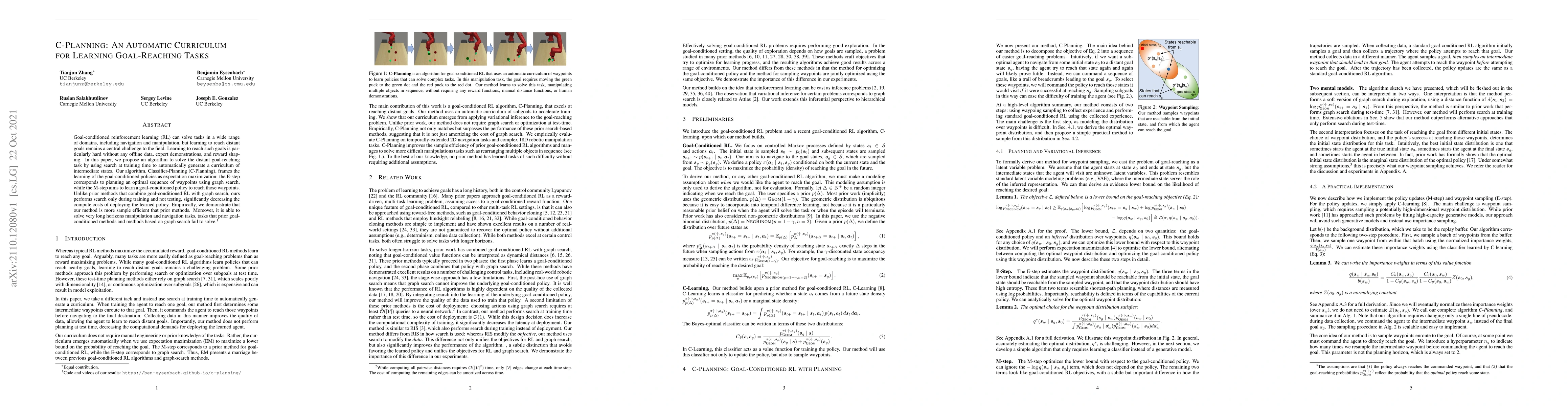 Goal-conditioned reinforcement learning (RL) can solve tasks in a wide range of domains, including navigation and manipulation, but learning to reach distant goals remains a central challenge to the field. Learning to reach such goals is particularly hard without any offline data, expert demonstrations, and reward shaping. In this paper, we propose an algorithm to solve the distant goal-reaching task by using search at training time to automatically generate a curriculum of intermediate states. Our algorithm, Classifier-Planning (C-Planning), frames the learning of the goal-conditioned policies as expectation maximization: the E-step corresponds to planning an optimal sequence of waypoints using graph search, while the M-step aims to learn a goal-conditioned policy to reach those waypoints. Unlike prior methods that combine goal-conditioned RL with graph search, ours performs search only during training and not testing, significantly decreasing the compute costs of deploying the learned policy. Empirically, we demonstrate that our method is more sample efficient than prior methods. Moreover, it is able to solve very long horizons manipulation and navigation tasks, tasks that prior goal-conditioned methods and methods based on graph search fail to solve.