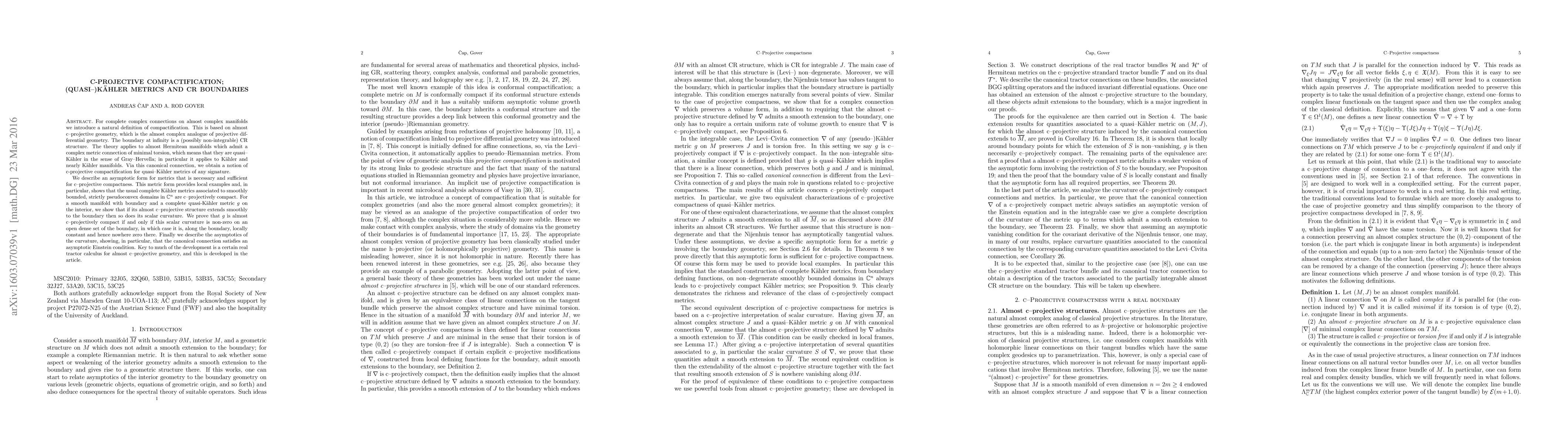 For complete complex connections on almost complex manifolds we introduce a natural definition of compactification. This is based on almost c--projective geometry, which is the almost complex analogue of projective differential geometry. The boundary at infinity is a (possibly non-integrable) CR structure. The theory applies to almost Hermitean manifolds which admit a complex metric connection of minimal torsion, which means that they are quasi--Kaehler in the sense of Gray--Hervella; in particular it applies to Kaehler and nearly Kaehler manifolds. Via this canonical connection, we obtain a notion of c-projective compactification for quasi--Kaehler metrics of any signature. We describe an asymptotic form for metrics that is necessary and sufficient for c--projective compactness. This metric form provides local examples and, in particular, shows that the usual complete Kaehler metrics associated to smoothly bounded, strictly pseudoconvex domains in C^n are c--projectively compact. For a smooth manifold with boundary and a complete quasi-Kaehler metric $g$ on the interior, we show that if its almost c--projective structure extends smoothly to the boundary then so does its scalar curvature. We prove that $g$ is almost c--projectively compact if and only if this scalar curvature is non-zero on an open dense set of the boundary, in which case it is, along the boundary, locally constant and hence nowhere zero there. Finally we describe the asymptotics of the curvature, showing, in particular, that the canonical connection satisfies an asymptotic Einstein condition. Key to much of the development is a certain real tractor calculus for almost c--projective geometry, and this is developed in the article.