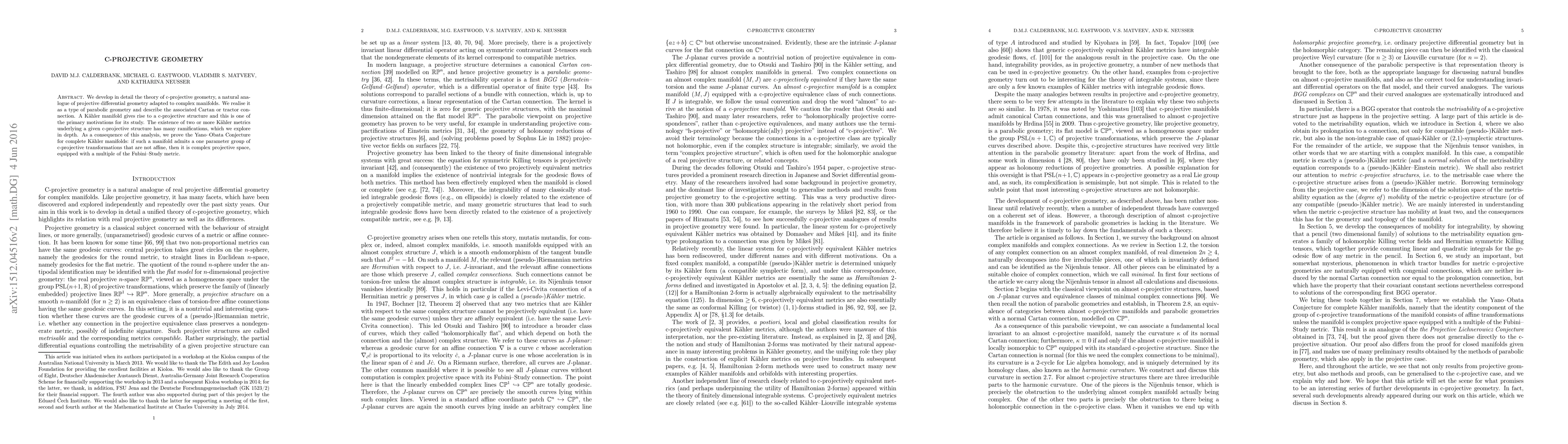 This paper develops the theory of c-projective geometry, an analogue of projective differential geometry for complex manifolds, and proves the Yano-Obata conjecture for complete Kähler manifolds, showing that such manifolds are complex projective space with a multiple of the Fubini-Study metric if they admit a non-affine one-parameter group of c-projective transformations.