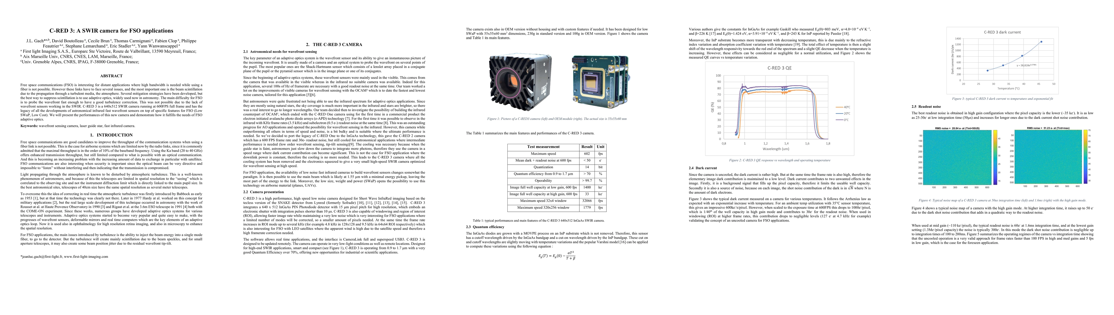 Free space communications (FSO) is interesting for distant applications where high bandwidth is needed while using a fiber is not possible. However these links have to face several issues, and the most important one is the beam scintillation due to the propagation through a turbulent media, the atmosphere. Several mitigation strategies have been developed, but the best way to suppress scintillation is to use adaptive optics, widely used now in astronomy. The main difficulty for FSO is to probe the wavefront fast enough to have a good turbulence correction. This was not possible due to the lack of wavefront sensors working in the SWIR. C-RED 3 is a 640x512 SWIR camera running at 600FPS full frame and has the legacy of all the developments of astronomical infrared fast wavefront sensors on top of specific features for FSO (Low SWaP, Low Cost). We will present the performances of this new camera and demonstrate how it fulfills the needs of FSO adaptive optics.