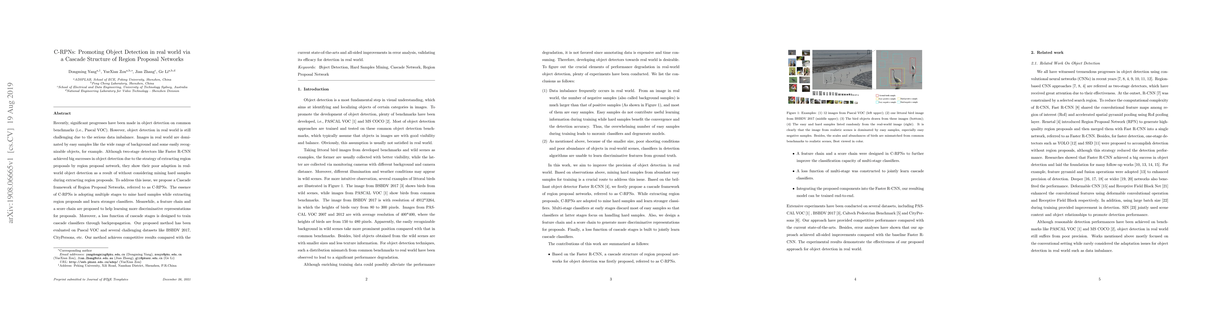 The paper proposes C-RPNs, a Cascade framework of Region Proposal Networks to improve object detection in real-world scenarios by addressing data imbalance through multiple stages to mine hard samples and learn stronger classifiers. The method achieves competitive results on benchmark and real-world datasets, demonstrating improved performance in challenging detection tasks.