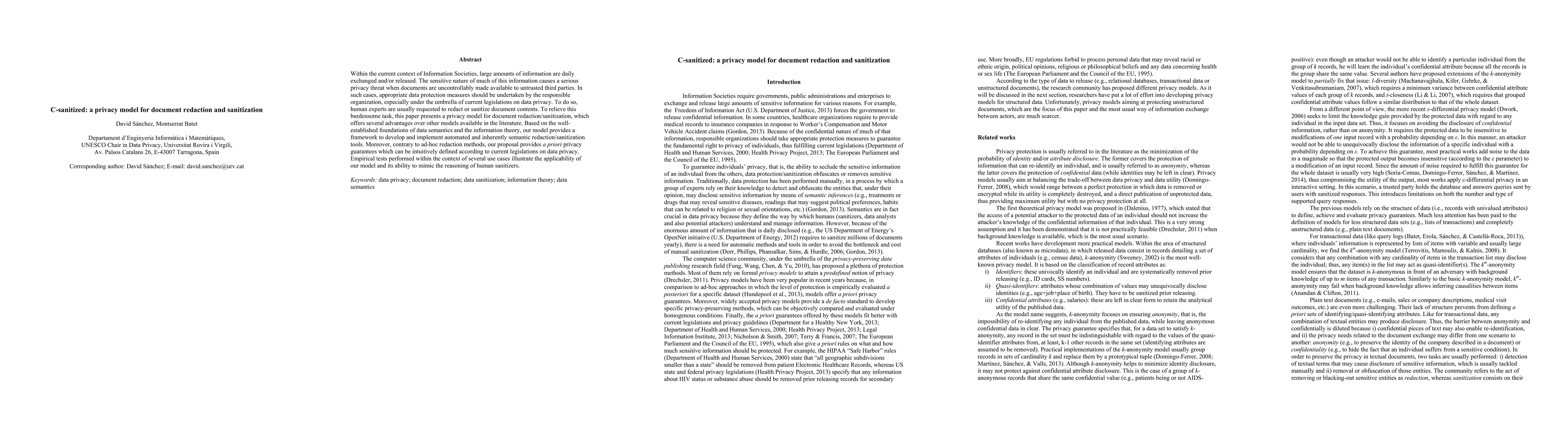 This paper introduces a privacy model for document redaction/sanitization, leveraging data semantics and information theory to provide automated tools that offer a priori privacy guarantees aligned with current data privacy legislations. Empirical tests demonstrate its effectiveness in mimicking human sanitizers' reasoning.
