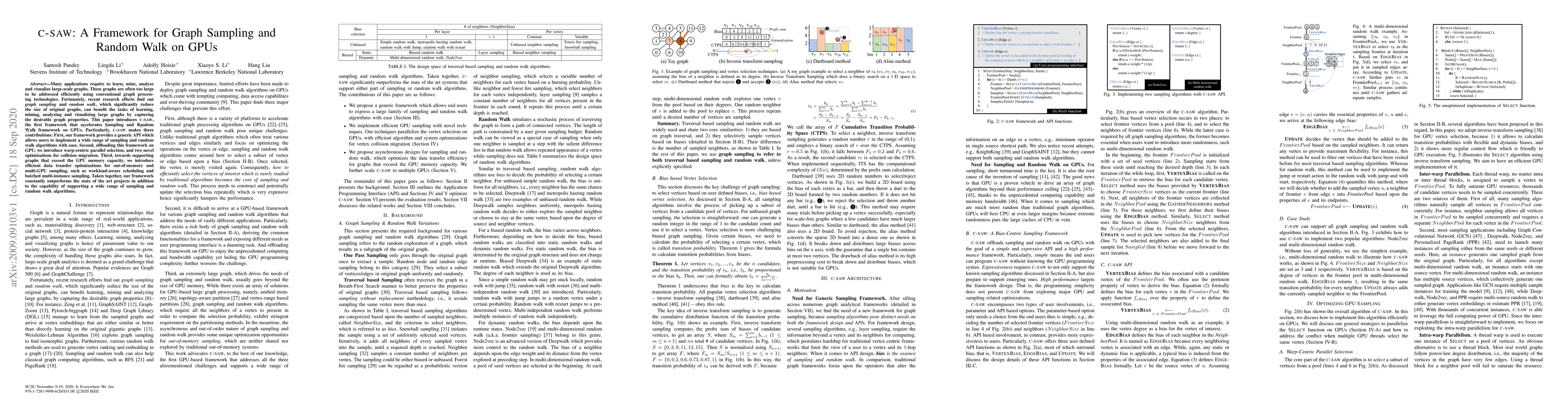 This paper introduces C-SAW, a GPU-based framework for efficient graph sampling and random walk, featuring a generic API, warp-centric parallel selection, and optimizations for collision migration, along with strategies for out-of-memory sampling and multi-GPU support, consistently outperforming existing state-of-the-art solutions.
