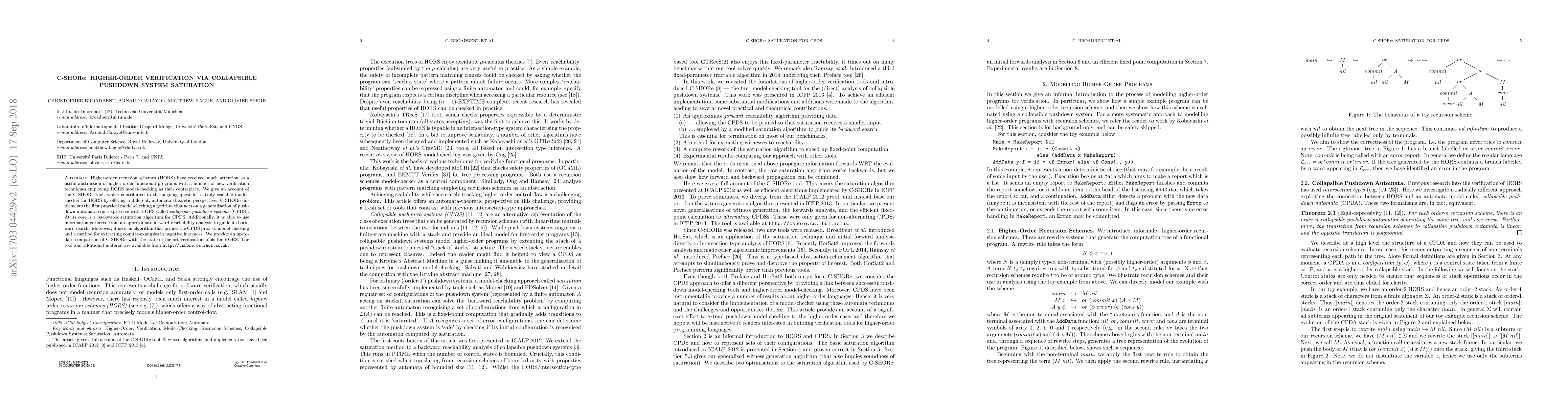 C-SHORe is a model-checking tool that verifies higher-order recursion schemes using collapsible pushdown systems, offering a scalable approach to HORS verification.