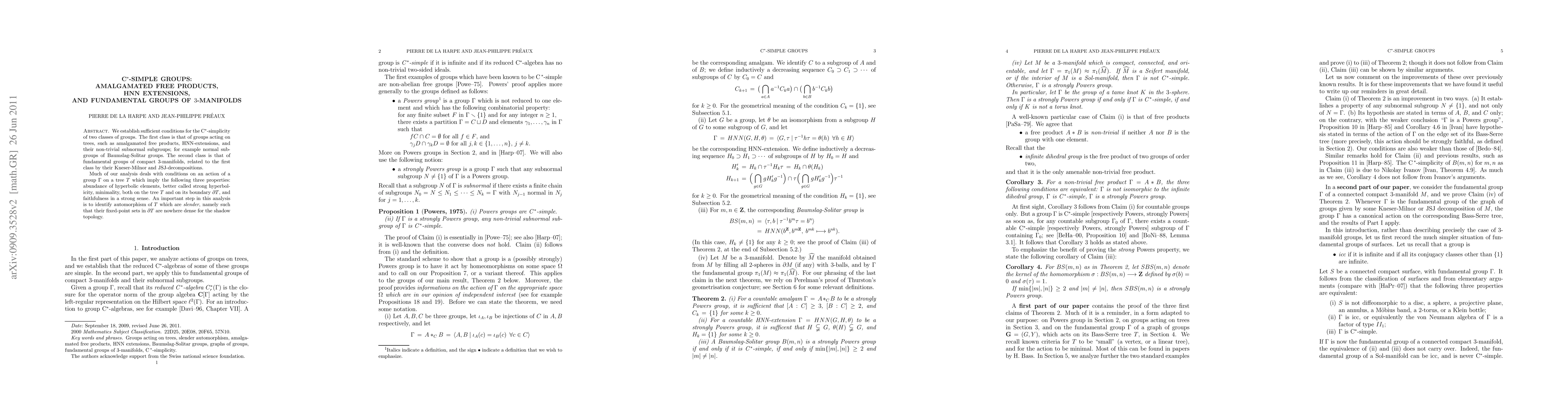 We establish sufficient conditions for the C$^*$-simplicity of two classes of groups. The first class is that of groups acting on trees, such as amalgamated free products, HNN-extensions, and their normal subgroups; for example normal subgroups of Baumslag-Solitar groups. The second class is that of fundamental groups of compact 3-manifolds, related to the first class by their Kneser-Milnor and JSJ-decompositions. Much of our analysis deals with conditions on an action of a group $\Gamma$ on a tree $T$ which imply the following three properties: abundance of hyperbolic elements, better called strong hyperbolicity, minimality, both on the tree $T$ and on its boundary $\partial T$, and faithfulness in a strong sense. An important step in this analysis is to identify automorphism of $T$ which are \emph{slender}, namely such that their fixed-point sets in $\partial T$ are nowhere dense for the shadow topology.