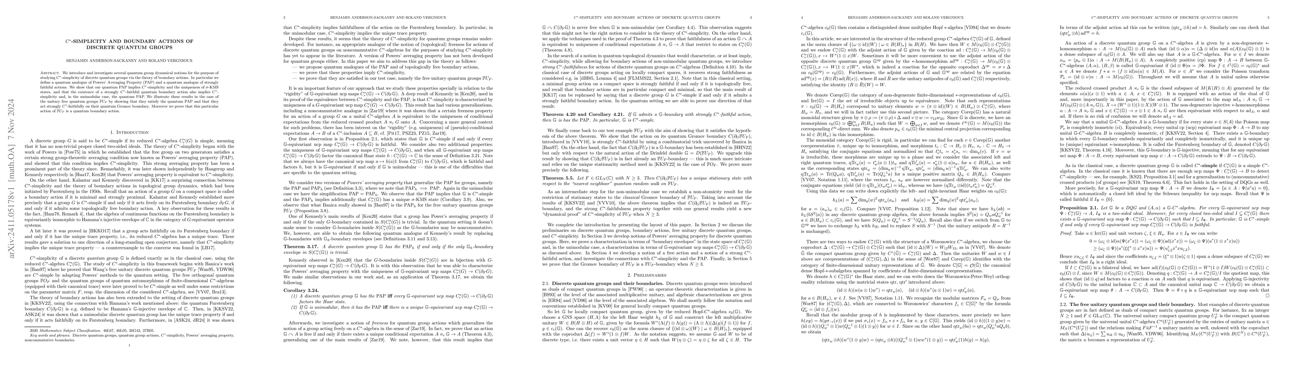 We introduce and investigate several quantum group dynamical notions for the purpose of studying $C^*$-simplicity of discrete quantum groups via the theory of boundary actions. In particular we define a quantum analogue of Powers' Averaging Property (PAP) and a quantum analogue of strongly faithful actions. We show that our quantum PAP implies $C^*$-simplicity and the uniqueness of $\sigma$-KMS states, and that the existence of a strongly $C^*$-faithful quantum boundary action also implies $C^*$-simplicity and, in the unimodular case, the quantum PAP. We illustrate these results in the case of the unitary free quantum groups $\mathbb{F} U_F$ by showing that they satisfy the quantum PAP and that they act strongly $C^*$-faithfully on their quantum Gromov boundary. Moreover we prove that this particular action of $\mathbb{F} U_F$ is a quantum boundary action.