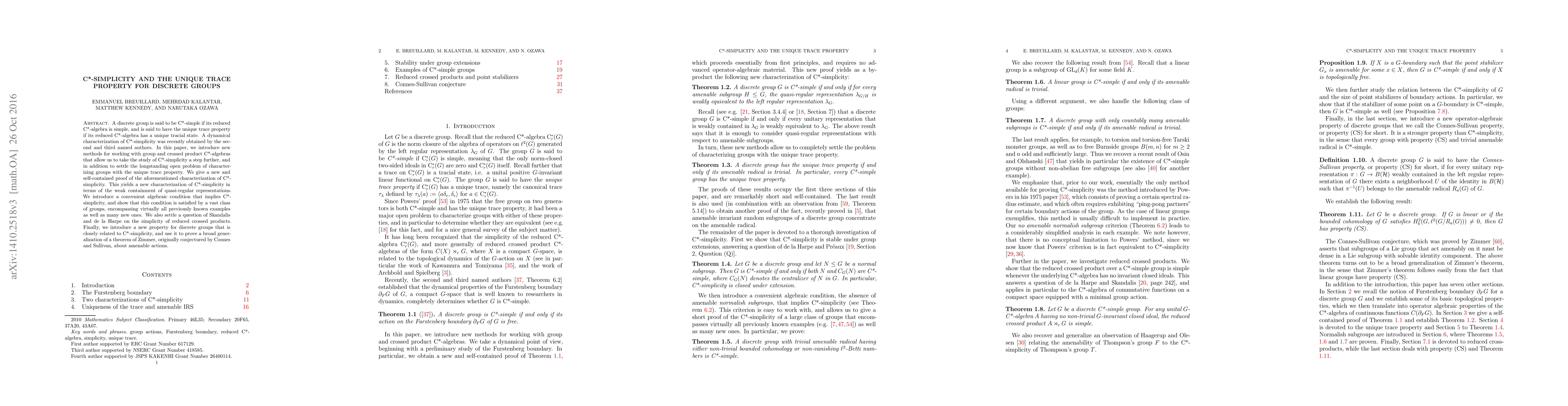 This paper develops new methods for studying C*-simplicity and the unique trace property in discrete groups, providing a new characterization of C*-simplicity and settling longstanding open problems regarding these properties. It also introduces a new algebraic condition that implies C*-simplicity and proves a broad generalization of a theorem by Zimmer.
