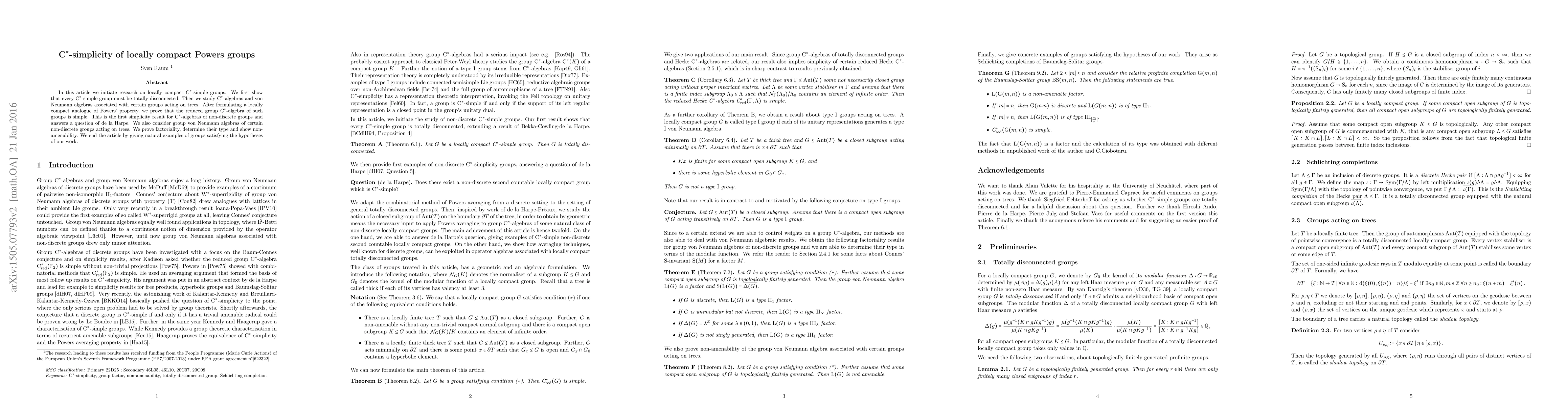 In this article we initiate research on locally compact C*-simple groups. We first show that every C*-simple group must be totally disconnected. Then we study C*-algebras and von Neumann algebras associated with certain groups acting on trees. After formulating a locally compact analogue of Powers' property, we prove that the reduced group C*-algebra of such groups is simple. This is the first simplicity result for C*-algebras of non-discrete groups and answers a question of de la Harpe. We also consider group von Neumann algebras of certain non-discrete groups acting on trees. We prove factoriality, determine their type and show non-amenability. We end the article by giving natural examples of groups satisfying the hypotheses of our work.