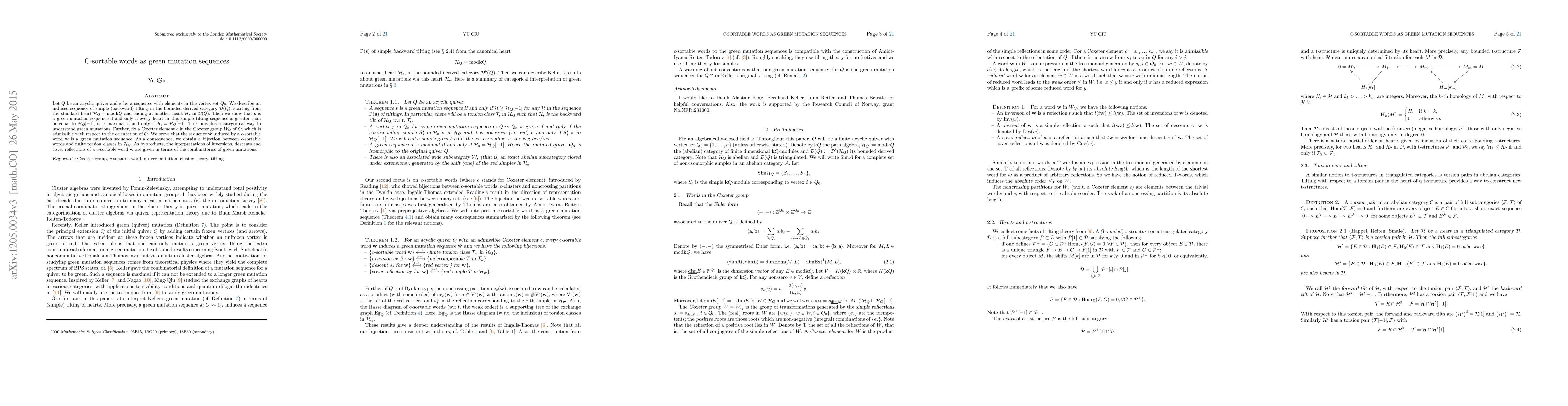 Let $Q$ be an acyclic quiver and $\mathbf{s}$ be a sequence with elements in the vertex set $Q_0$. We describe an induced sequence of simple (backward) tilting in the bounded derived category $\mathcal{D}(Q)$, starting from the standard heart $\mathcal{H}_Q=\operatorname{mod}\mathbf{k}Q$ and ending at another heart $\mathcal{H}_\mathbf{s}$ in $\mathcal{D}(Q)$. Then we show that $\mathbf{s}$ is a green mutation sequence if and only if every heart in this simple tilting sequence is greater than or equal to $\mathcal{H}_Q[-1]$; it is maximal if and only if $\mathcal{H}_\mathbf{s}=\mathcal{H}_Q[-1]$. This provides a categorical way to understand green mutations. Further, fix a Coxeter element $c$ in the Coxeter group $W_Q$ of $Q$, which is admissible with respect to the orientation of $Q$. We prove that the sequence $\widetilde{\mathbf{w}}$ induced by a $c$-sortable word $\mathbf{w}$ is a green mutation sequence. As a consequence, we obtain a bijection between $c$-sortable words and finite torsion classes in $\mathcal{H}_Q$. As byproducts, the interpretations of inversions, descents and cover reflections of a $c$-sortable word $\mathbf{w}$ are given in terms of the combinatorics of green mutations.