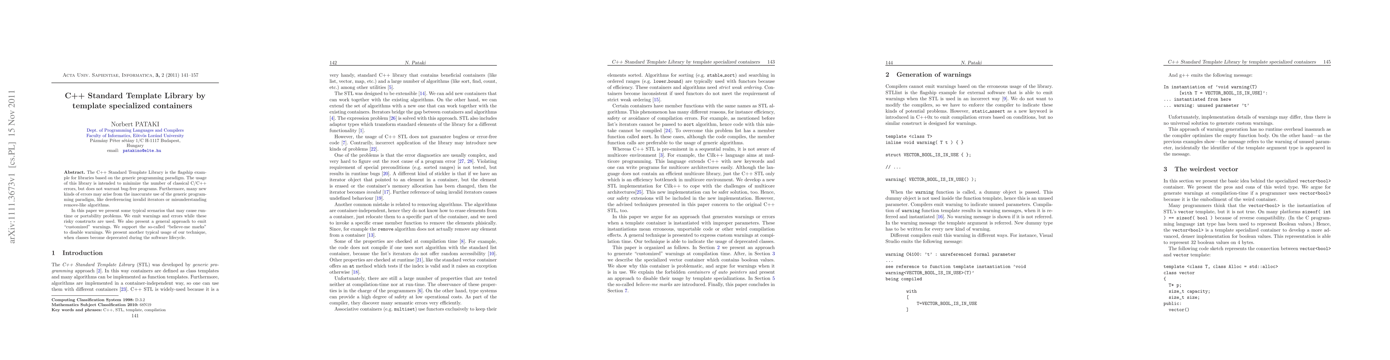 This paper examines the C++ Standard Template Library (STL) and highlights common pitfalls in its generic programming paradigm, such as invalid iterators and misuse of algorithms. It proposes a method to emit warnings and errors for risky constructs, including "believe-me marks" to disable warnings, and discusses handling deprecated classes during software evolution.