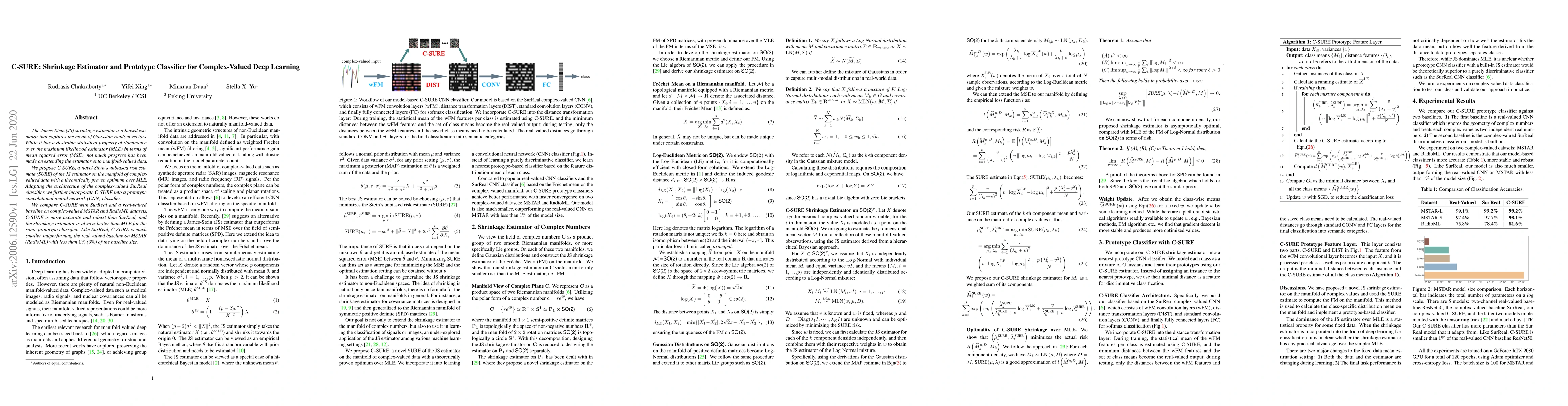 The James-Stein (JS) shrinkage estimator is a biased estimator that captures the mean of Gaussian random vectors.While it has a desirable statistical property of dominance over the maximum likelihood estimator (MLE) in terms of mean squared error (MSE), not much progress has been made on extending the estimator onto manifold-valued data. We propose C-SURE, a novel Stein's unbiased risk estimate (SURE) of the JS estimator on the manifold of complex-valued data with a theoretically proven optimum over MLE. Adapting the architecture of the complex-valued SurReal classifier, we further incorporate C-SURE into a prototype convolutional neural network (CNN) classifier. We compare C-SURE with SurReal and a real-valued baseline on complex-valued MSTAR and RadioML datasets. C-SURE is more accurate and robust than SurReal, and the shrinkage estimator is always better than MLE for the same prototype classifier. Like SurReal, C-SURE is much smaller, outperforming the real-valued baseline on MSTAR (RadioML) with less than 1 percent (3 percent) of the baseline size