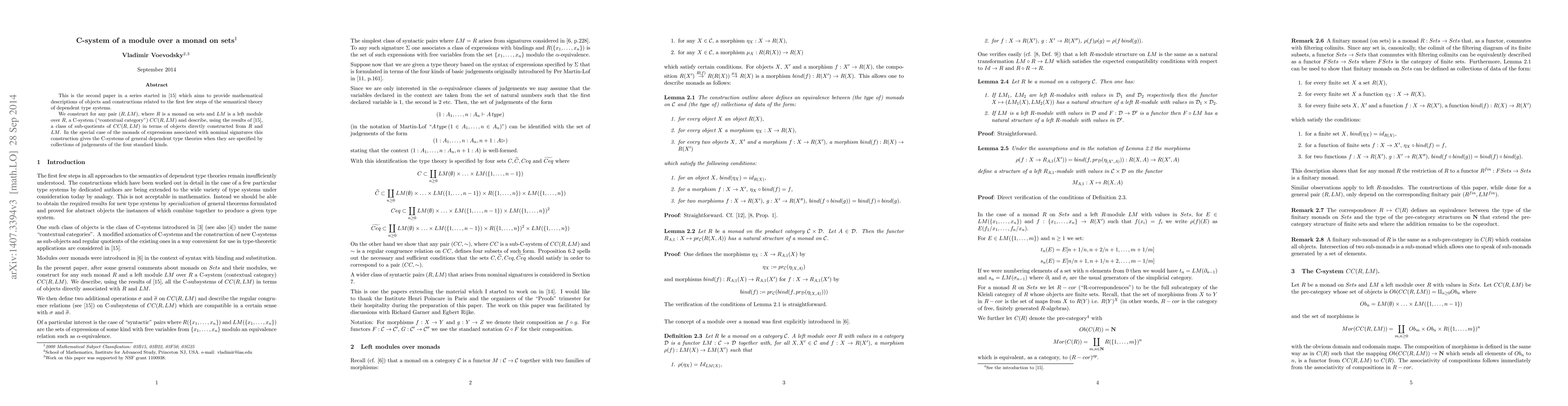 This is the second paper in a series that aims to provide mathematical descriptions of objects and constructions related to the first few steps of the semantical theory of dependent type systems. We construct for any pair $(R,LM)$, where $R$ is a monad on sets and $LM$ is a left module over $R$, a C-system (contextual category) $CC(R,LM)$ and describe a class of sub-quotients of $CC(R,LM)$ in terms of objects directly constructed from $R$ and $LM$. In the special case of the monads of expressions associated with nominal signatures this construction gives the C-systems of general dependent type theories when they are specified by collections of judgements of the four standard kinds.