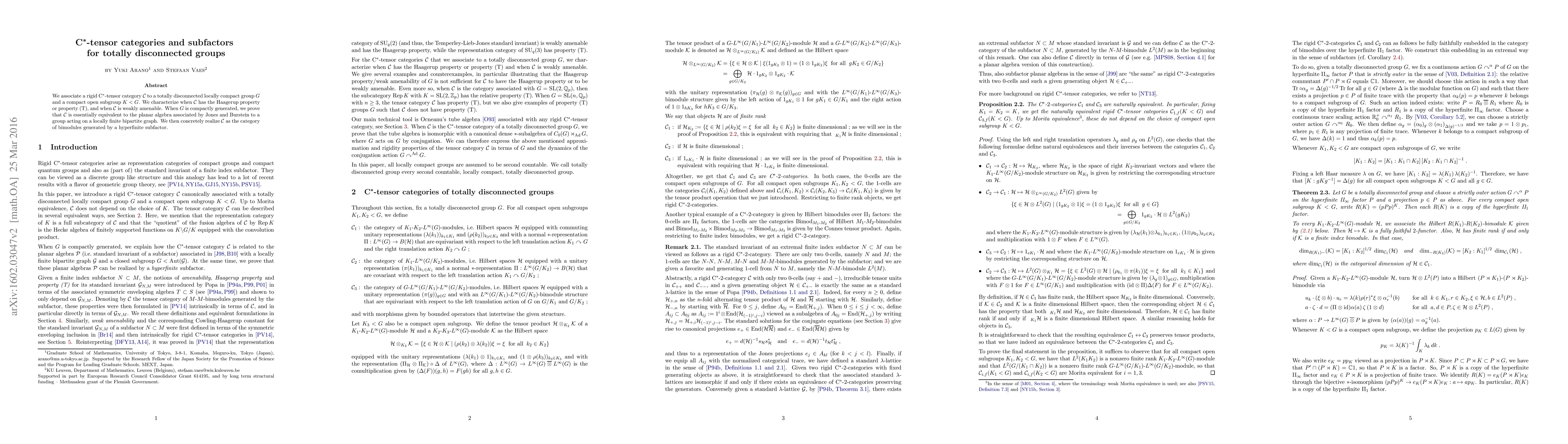 This paper associates a rigid C*-tensor category $C$ to a totally disconnected locally compact group $G$ and a compact open subgroup $K < G$. It characterizes $C$'s Haagerup, property (T), and weak amenability properties, and proves that for compactly generated $G$, $C$ is equivalent to a planar algebra linked to a group action on a locally finite bipartite graph, realized as a hyperfinite subfactor category.