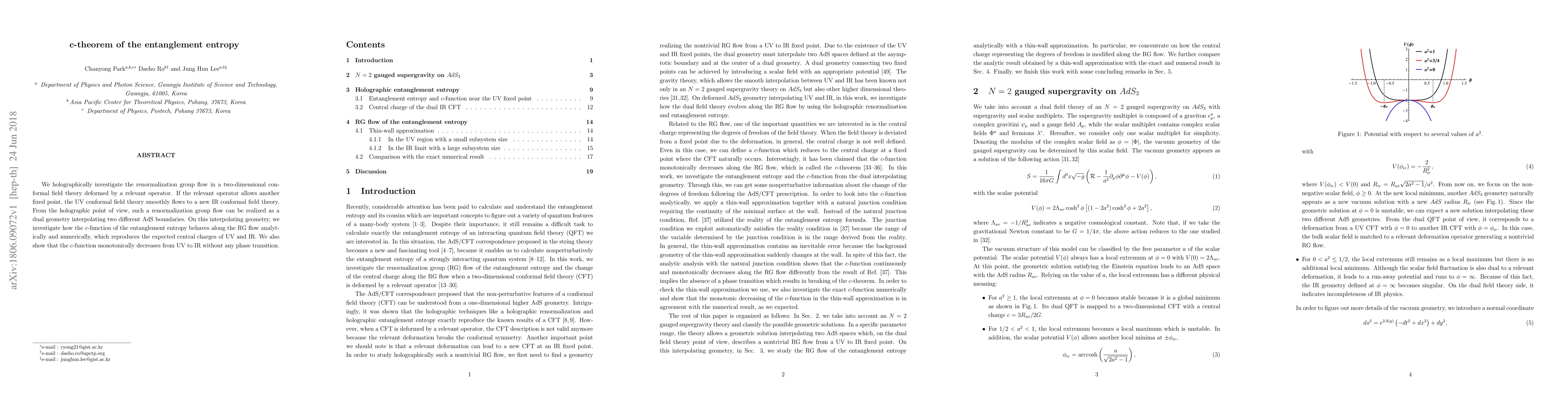 This paper studies the renormalization group flow in a 2D conformal field theory via holography, showing that the c-function of entanglement entropy monotonically decreases from the UV to the IR without phase transitions, matching the expected central charges of both conformal field theories.