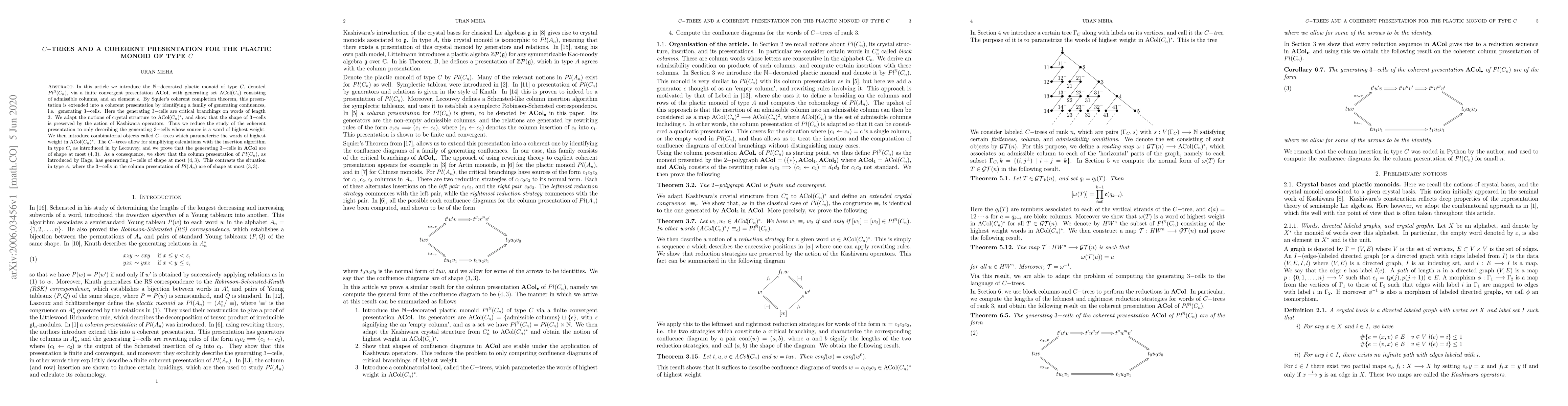 In this article we introduce the $\mathbb{N}-$decorated plactic monoid of type $C$, denoted $Pl^\mathbb{N}(C_n)$, via a finite convergent presentation $ACol$, with generating set $ACol(C_n)$ consisting of admissible columns, and an element $\epsilon$. By Squier's coherent completion theorem, this presentation is extended into a coherent presentation by identifying a family of generating confluences, i.e. generating $3-$cells. Here the generating $3-$cells are critical branchings on words of length $3$. We adapt the notions of crystal structure to $ACol(C_n)^\ast$ , and show that the shape of $3-$cells is preserved by the action of Kashiwara operators. Thus we reduce the study of the coherent presentation to only describing the generating $3-$cells whose source is a word of highest weight. We then introduce combinatorial objects called $C-$trees which parameterize the words of highest weight in $ACol(C_n)^\ast$. The $C-$trees allow for simplifying calculations with the insertion algorithm in type $C$, as introduced in by Lecouvey, and we prove that the generating $3-$cells in $ACol$ are of shape at most $(4,3)$. As a consequence, we show that the column presentation of $Pl(C_n)$, as introduced by Hage, has generating $3-$cells of shape at most $(4,3)$. This contrasts the situation in type $A$, where the $3-$cells in the column presentation of $Pl(A_n)$ are of shape at most $(3,3)$.