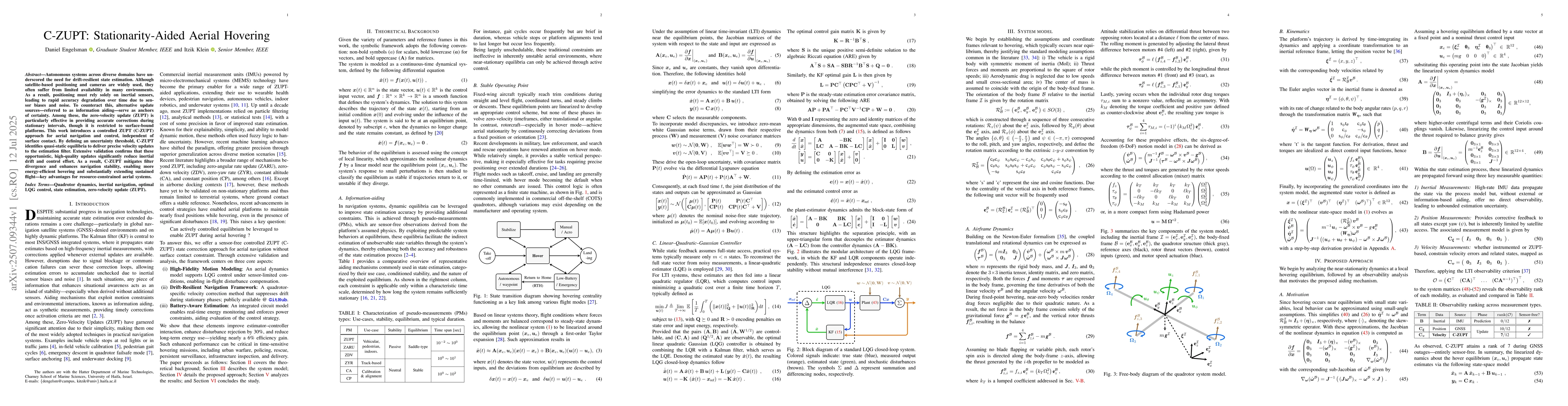 Autonomous systems across diverse domains have underscored the need for drift-resilient state estimation. Although satellite-based positioning and cameras are widely used, they often suffer from limited availability in many environments. As a result, positioning must rely solely on inertial sensors, leading to rapid accuracy degradation over time due to sensor biases and noise. To counteract this, alternative update sources-referred to as information aiding-serve as anchors of certainty. Among these, the zero-velocity update (ZUPT) is particularly effective in providing accurate corrections during stationary intervals, though it is restricted to surface-bound platforms. This work introduces a controlled ZUPT (C-ZUPT) approach for aerial navigation and control, independent of surface contact. By defining an uncertainty threshold, C-ZUPT identifies quasi-static equilibria to deliver precise velocity updates to the estimation filter. Extensive validation confirms that these opportunistic, high-quality updates significantly reduce inertial drift and control effort. As a result, C-ZUPT mitigates filter divergence and enhances navigation stability, enabling more energy-efficient hovering and substantially extending sustained flight-key advantages for resource-constrained aerial systems.